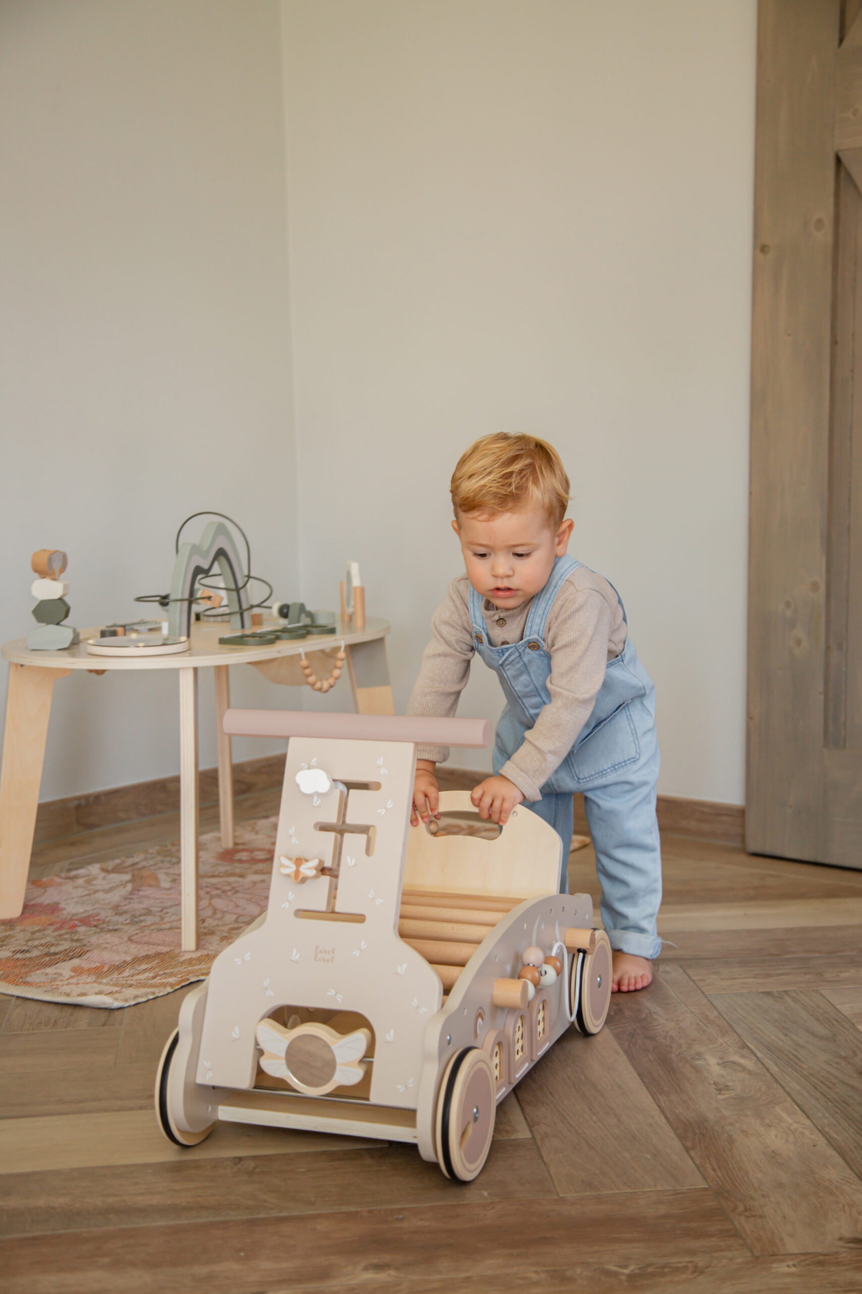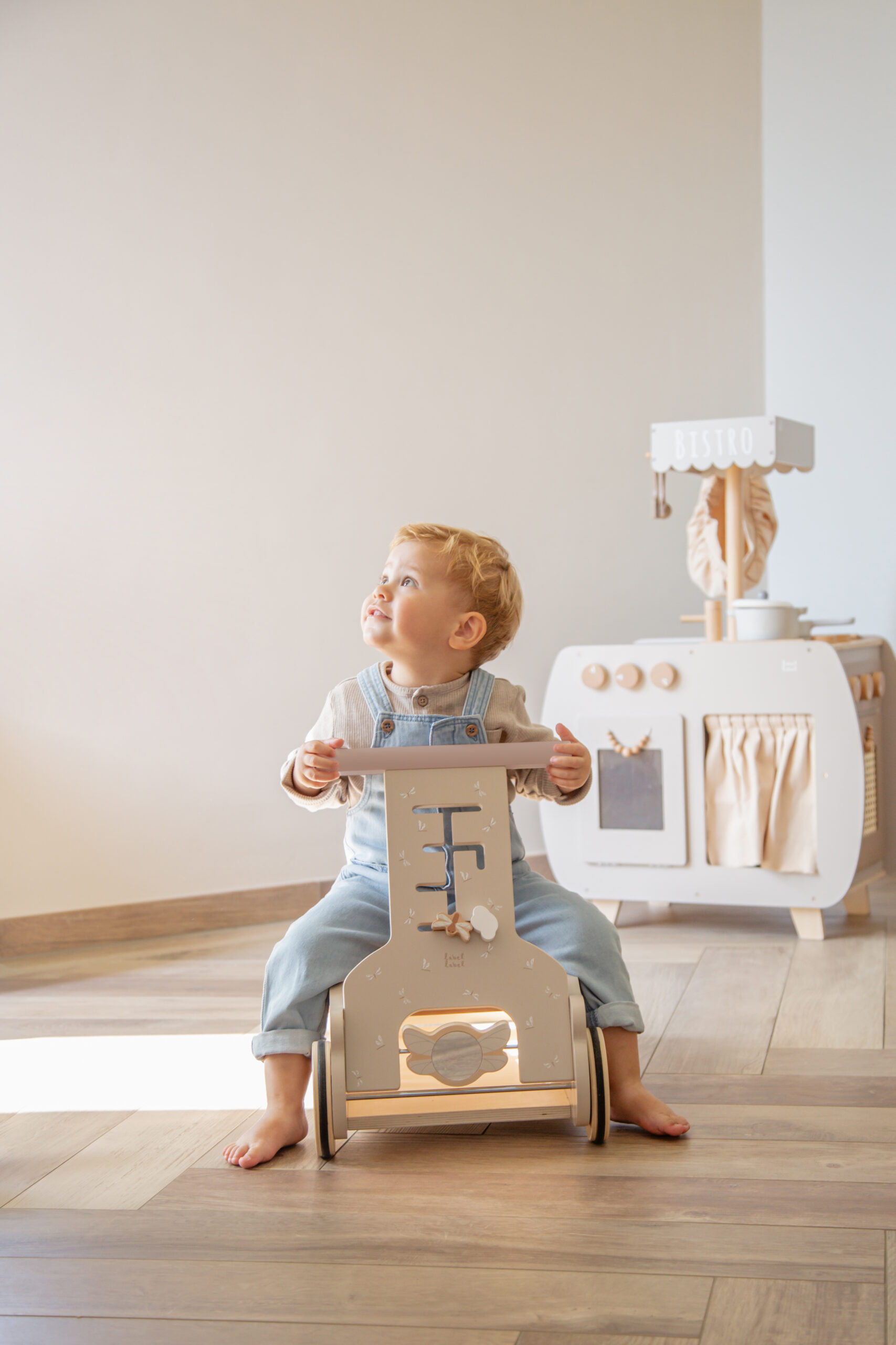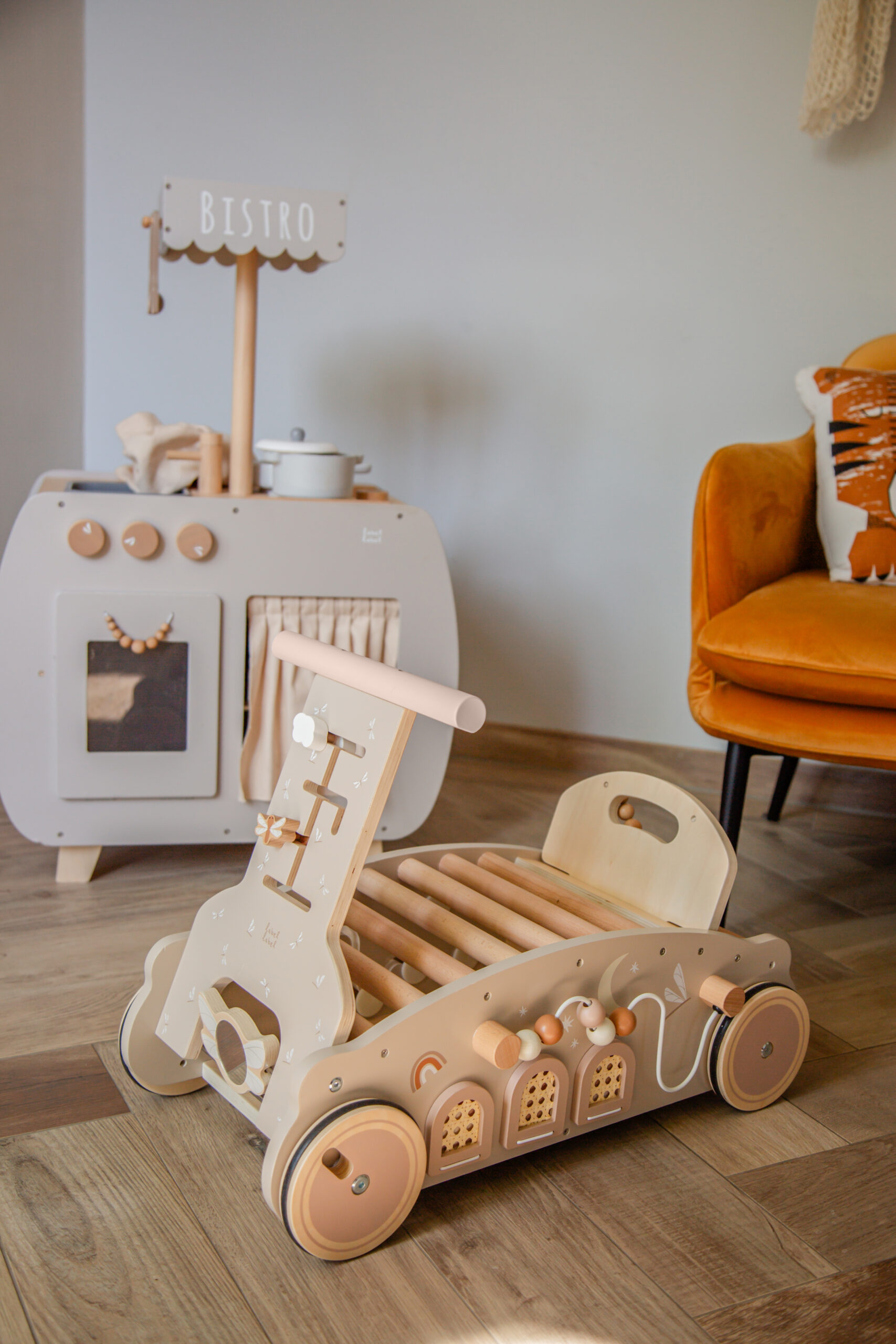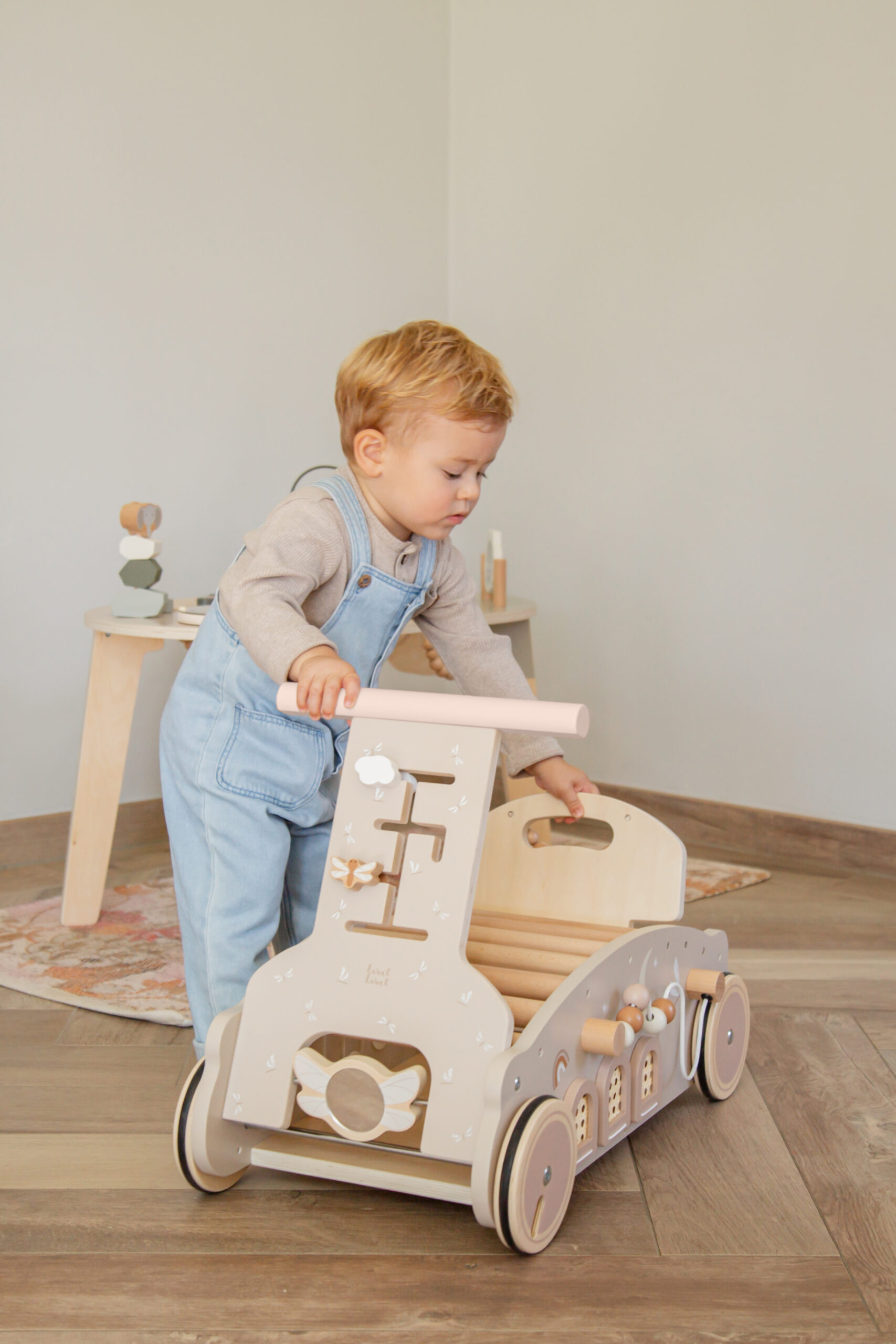 transform the walker into a rocking toy for a soothing and fun experience. The curved base allows for smooth rocking motions, providing your baby with a comforting way to relax or play. Your little one can sit on the bouclé cushion for ultimate comfort.