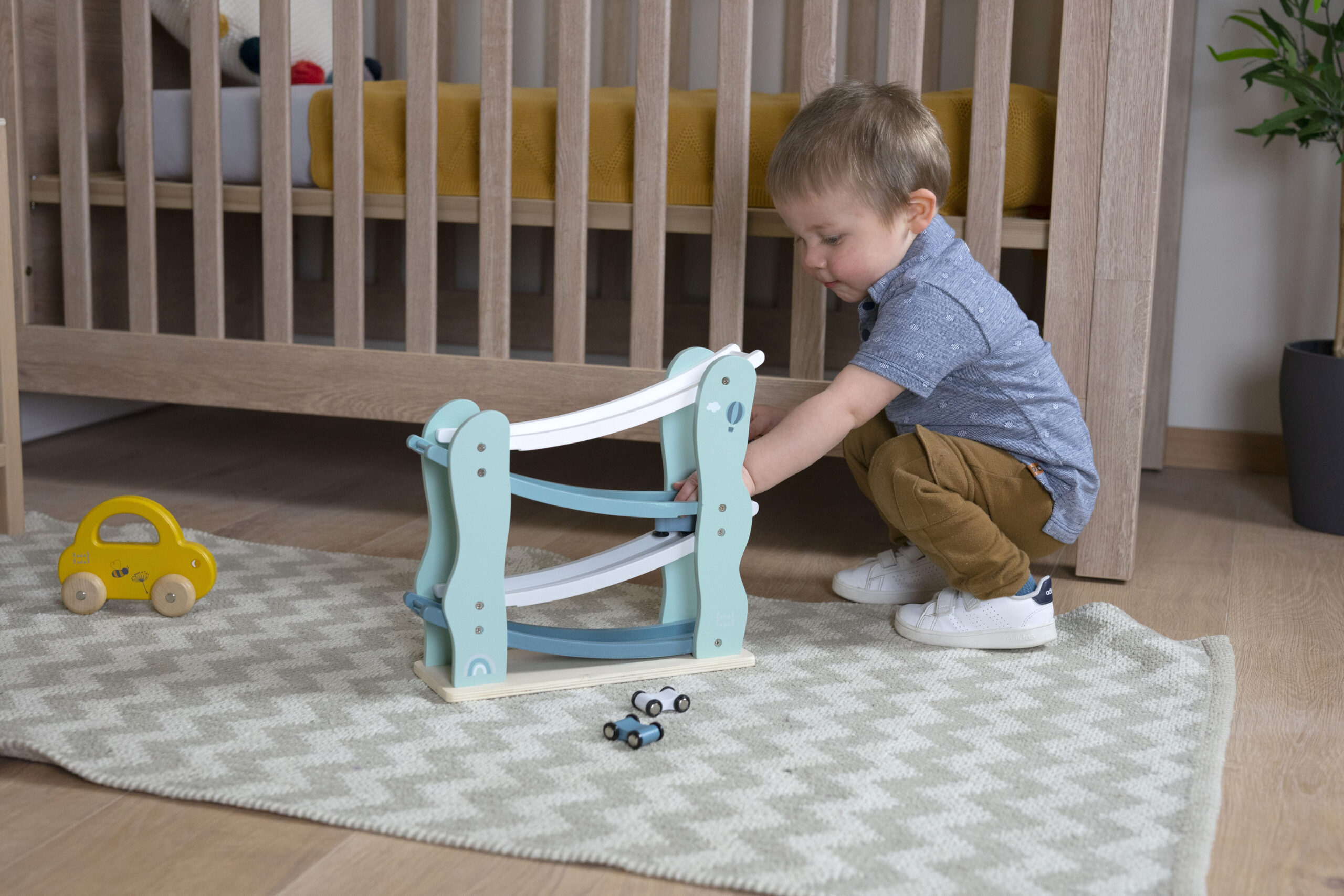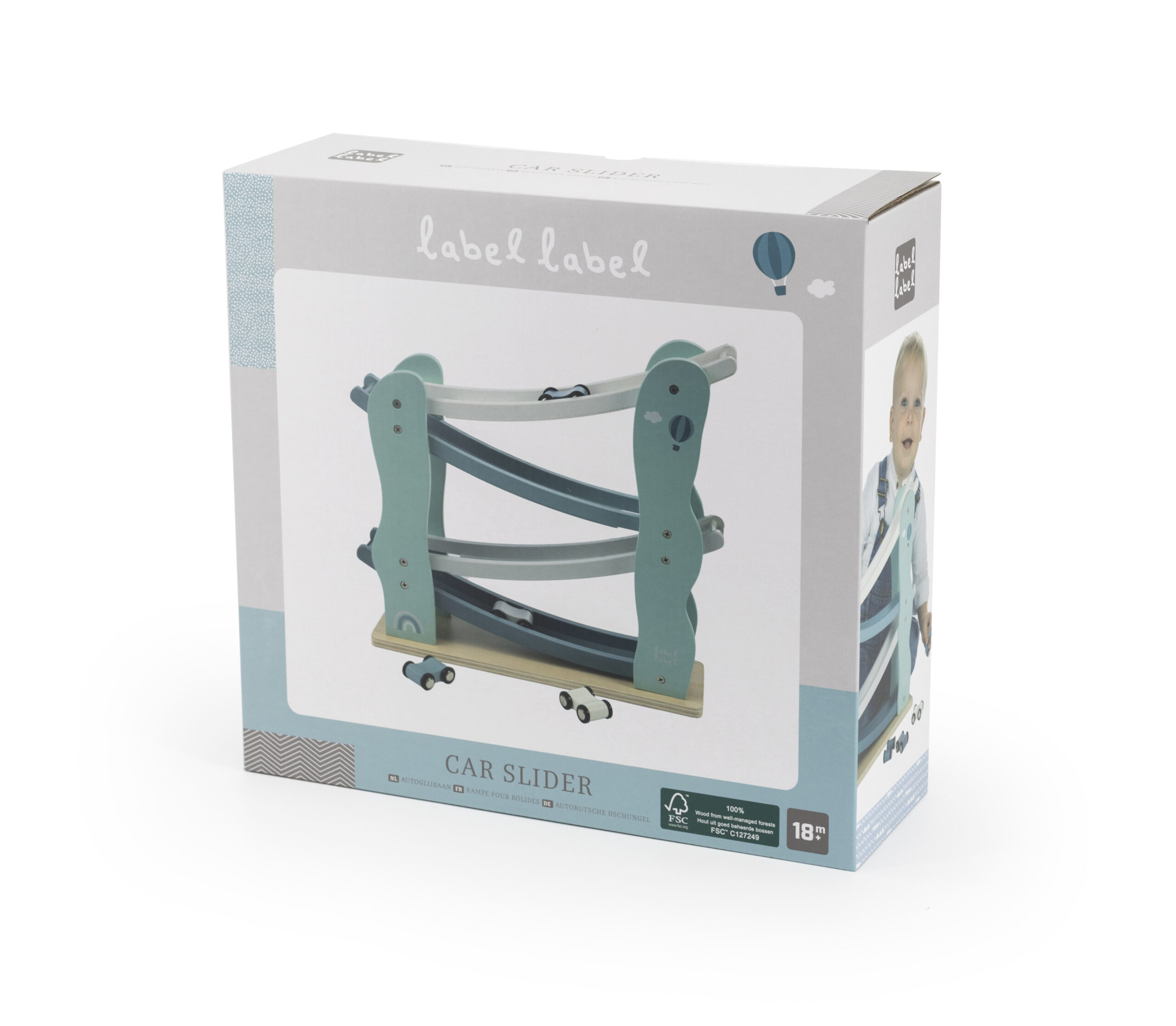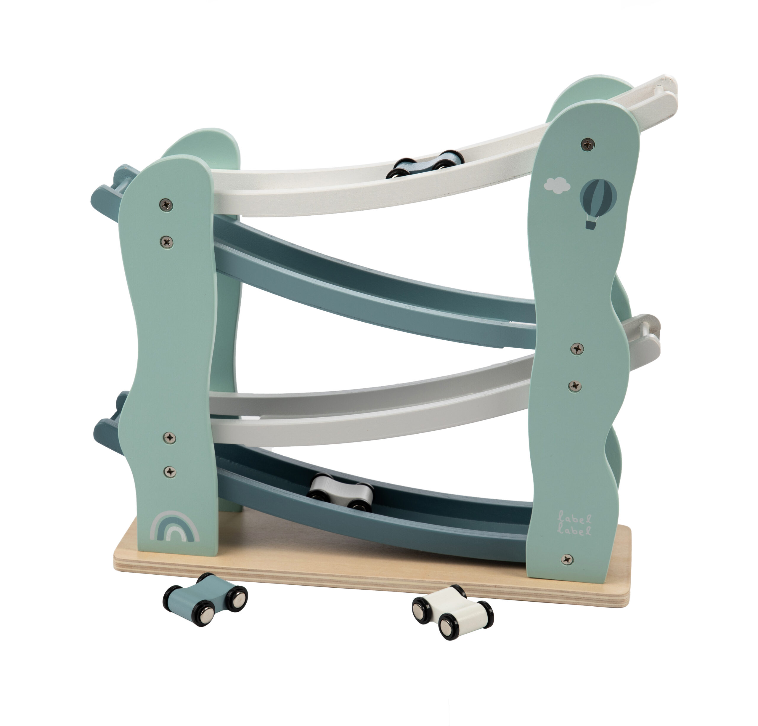 Skemmtileg bílabraut úr tré með 4 litlum bílum, blátt frá Label Label