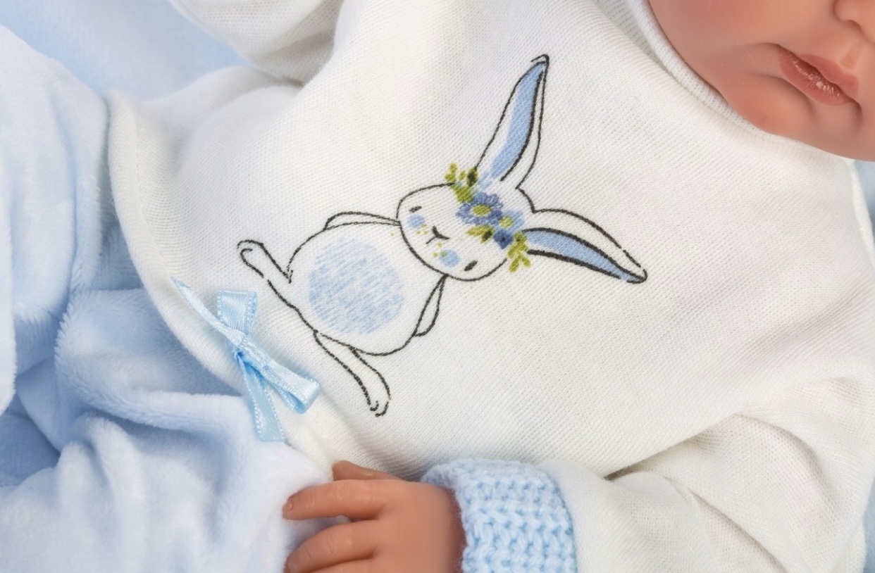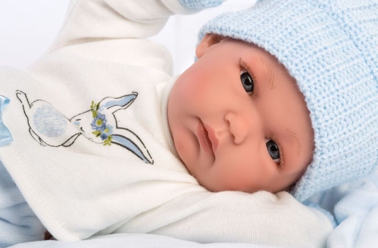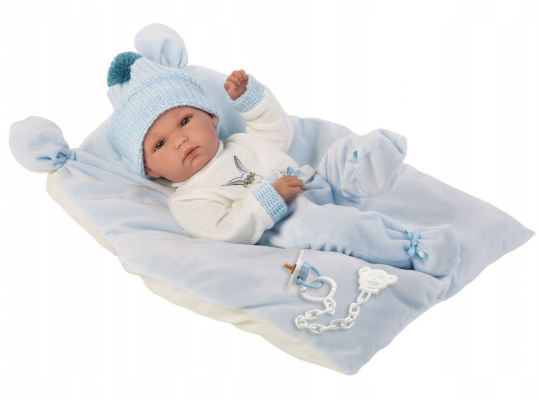 35 cm baby doll with blue eyes. The doll body is made of delicate vinyl like head, arms and legs. The full body vinyl doll is handmade and made in Spain. The baby dolls are refined and carefully crafted down to the smallest detail. The expressive faces give each doll their own personality. Love and care in the production is also shown in the clothing and accessories. These are made from real wool and fine fabrics. The doll comes in a high-quality gift box, which makes it the ideal gift.