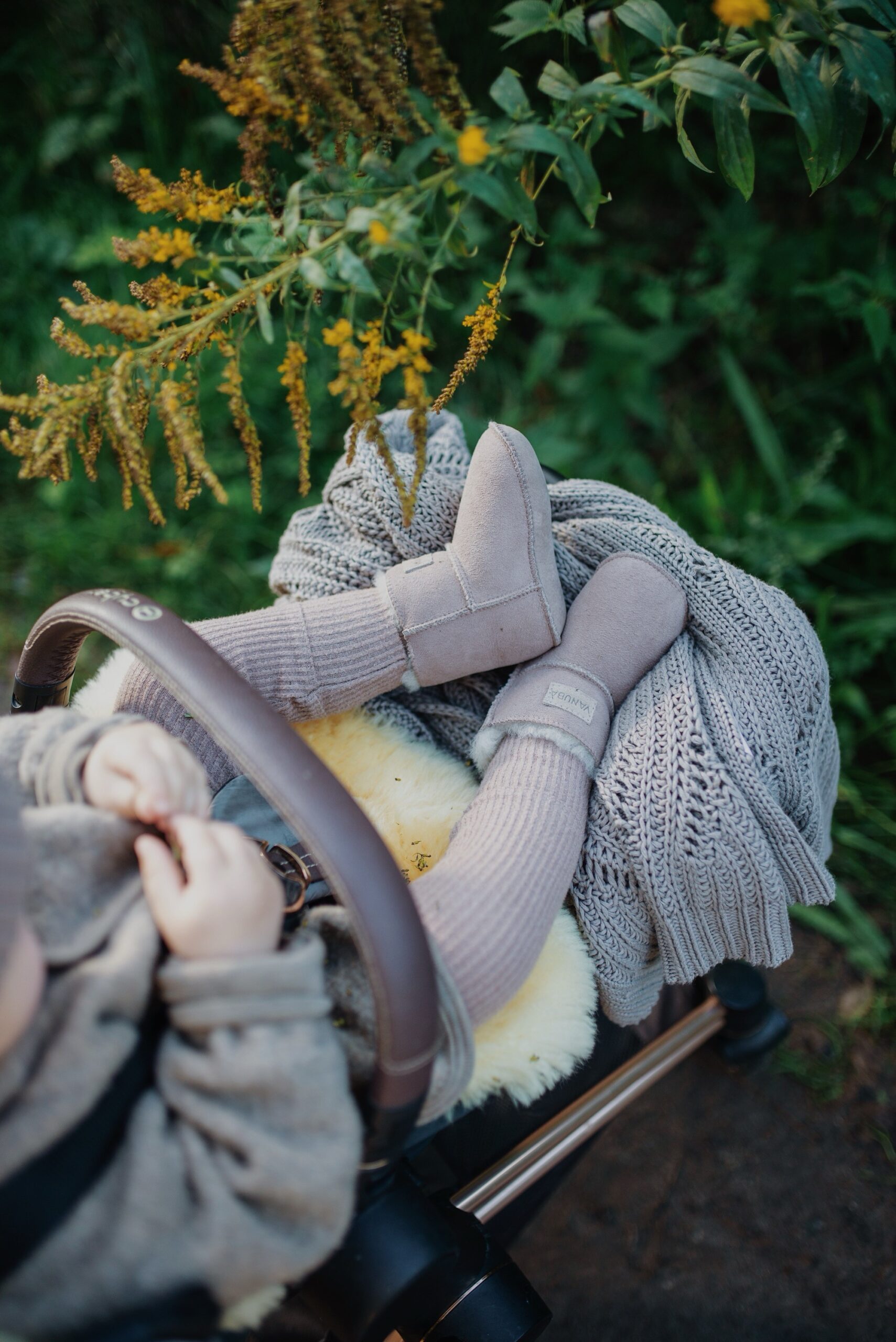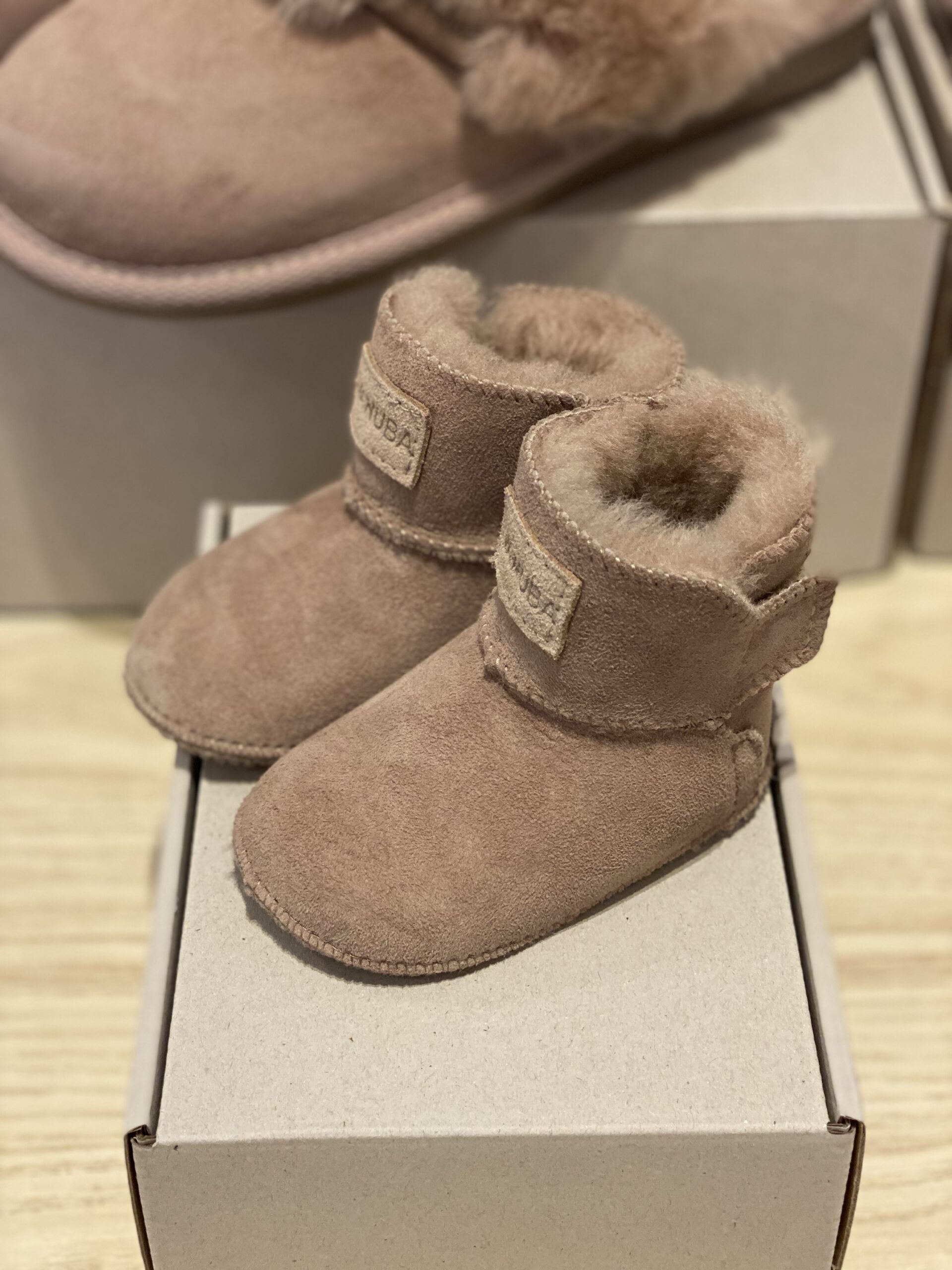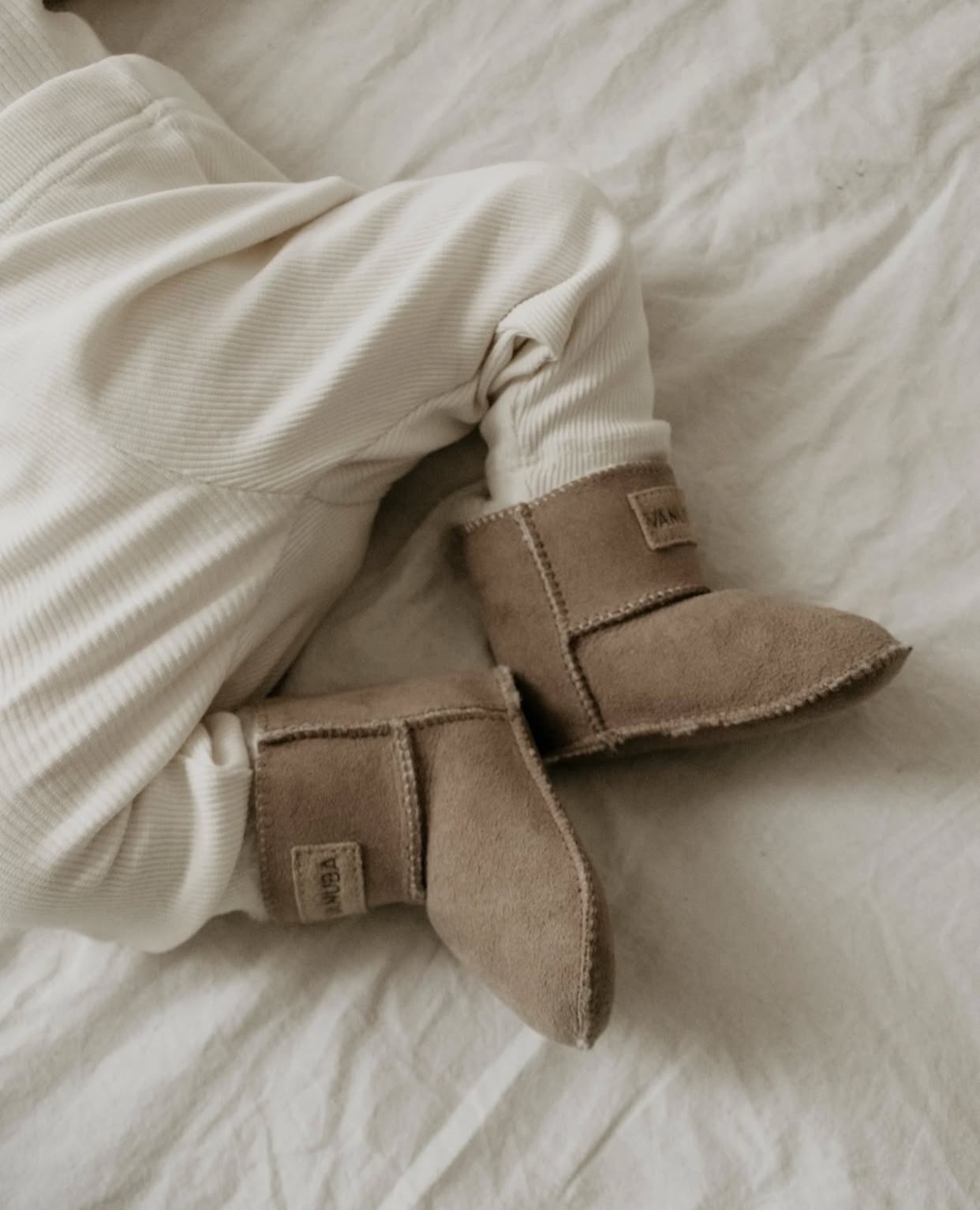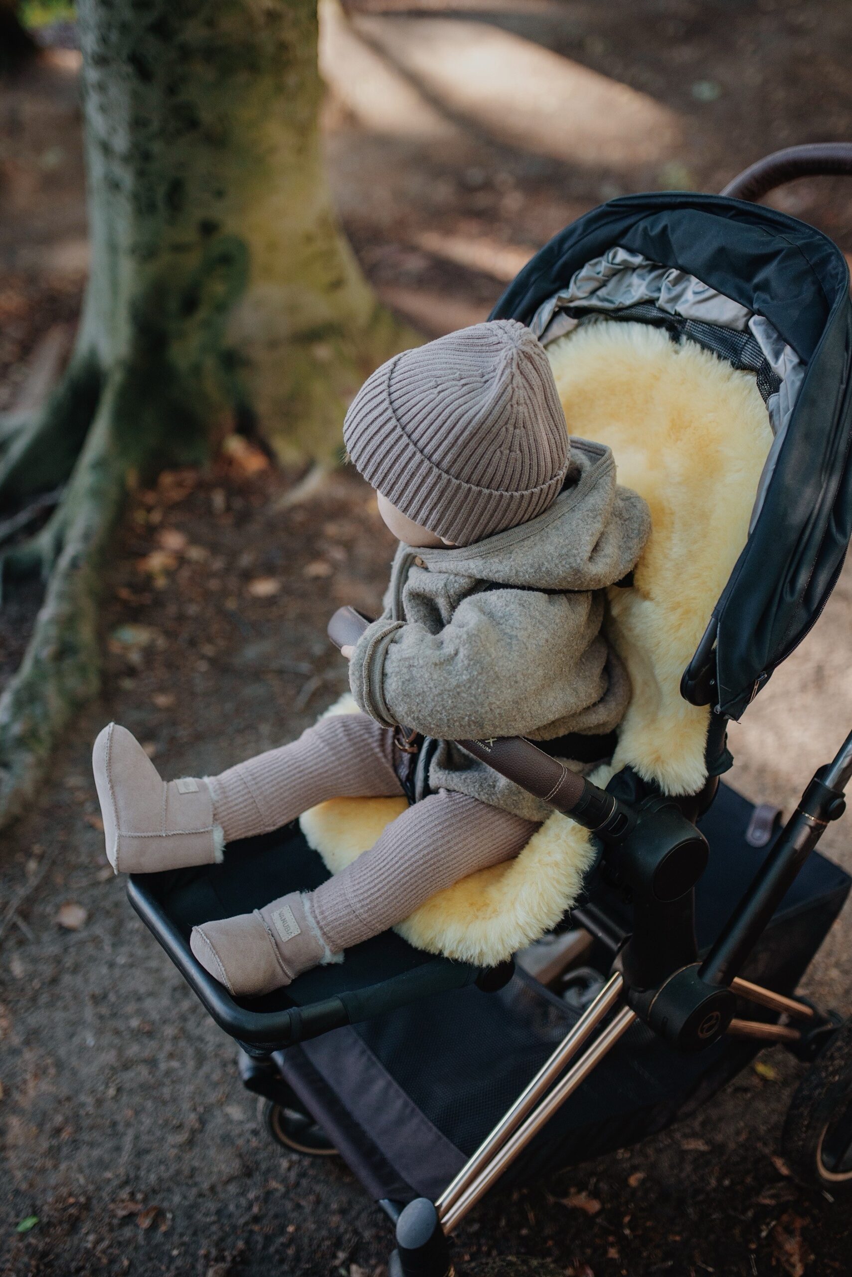 Innra byrðið er fyllt með mjúkri sauðarull sem er einstaklega húðvæn og hefur hipoalergísk áhrif. Hún dregur vel í sig raka og heldur fótunum þurrum og þægilegum. Náttúrulegir inniskór eru þægileg og örugg lausn sem heldur barninu hlýju frá fyrstu vikunum.