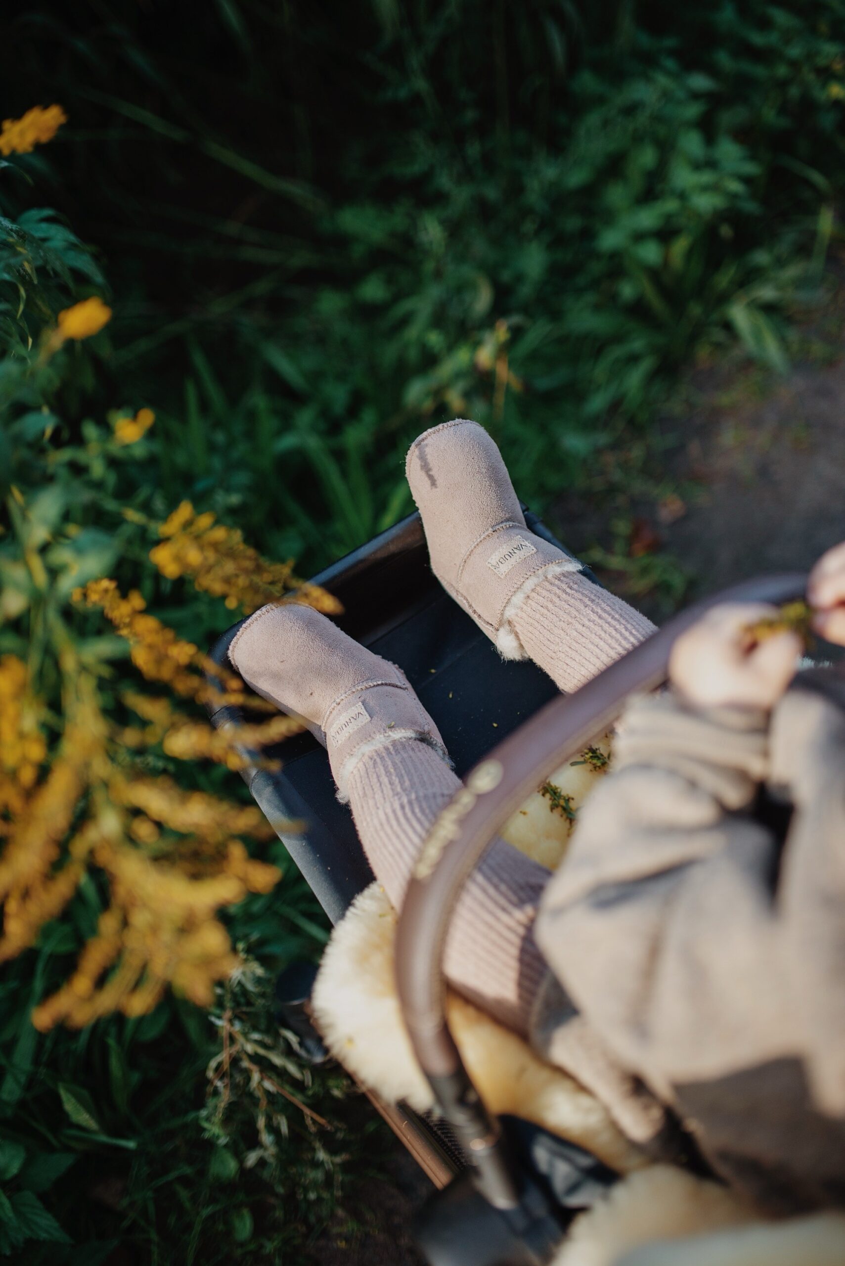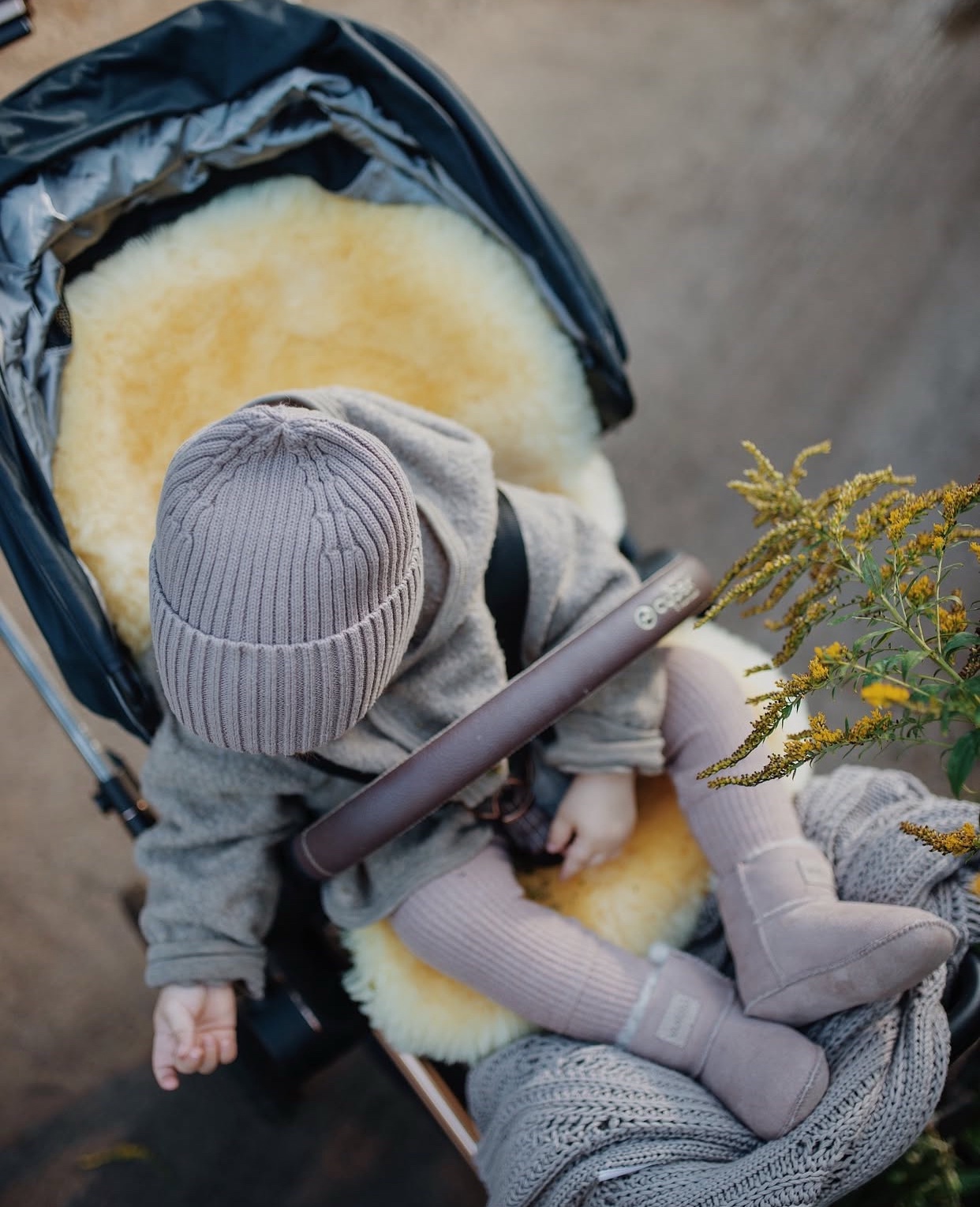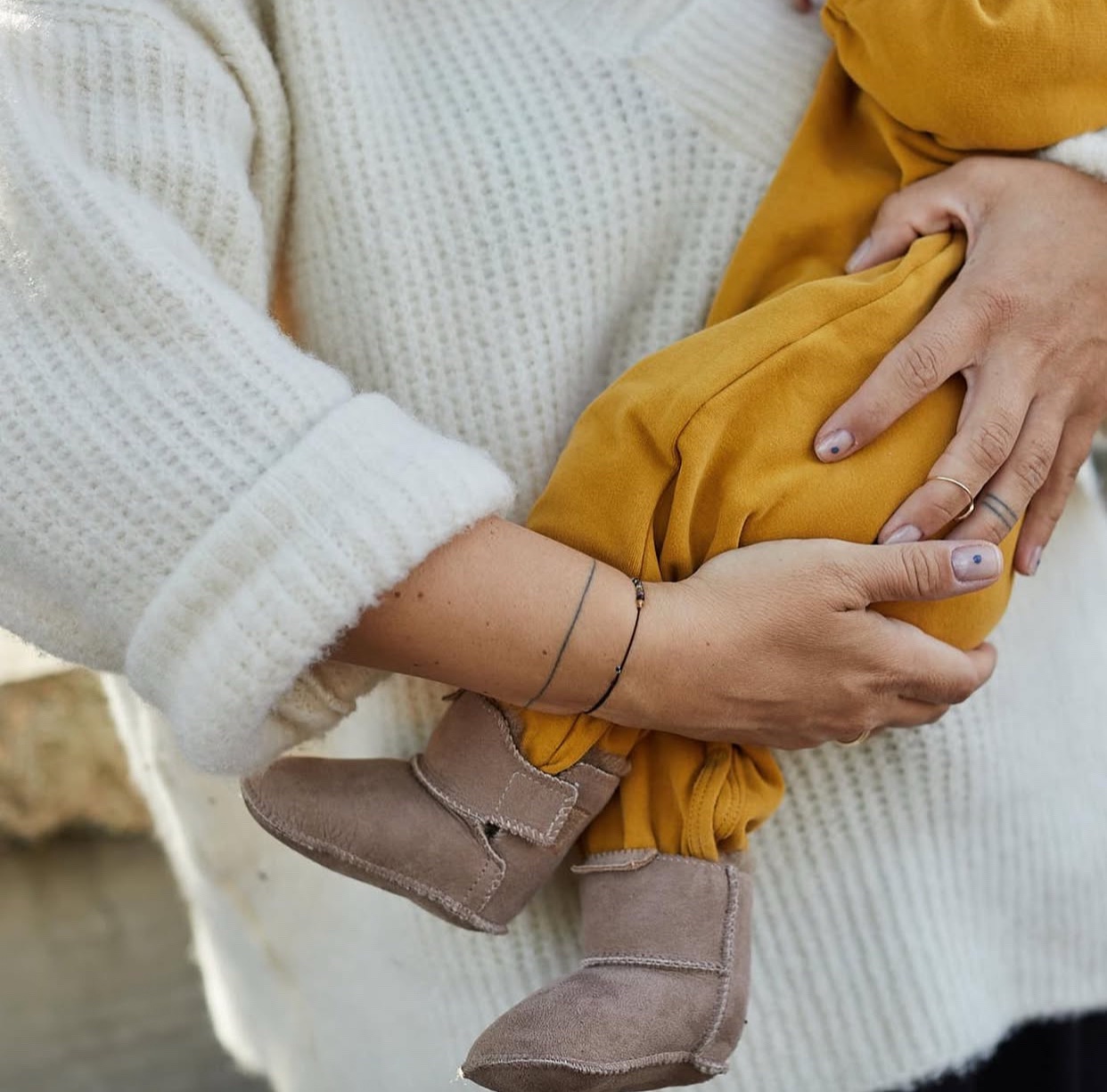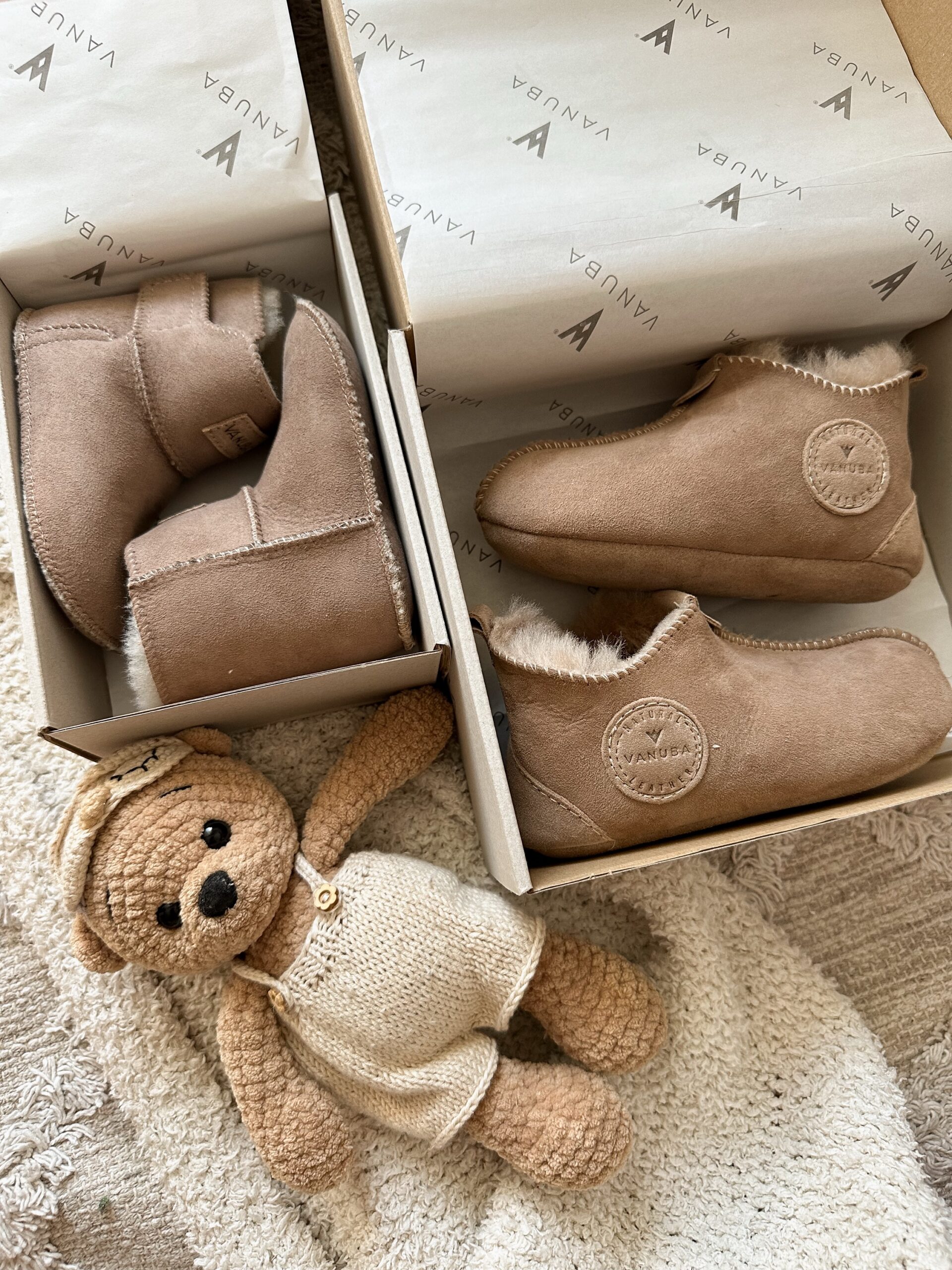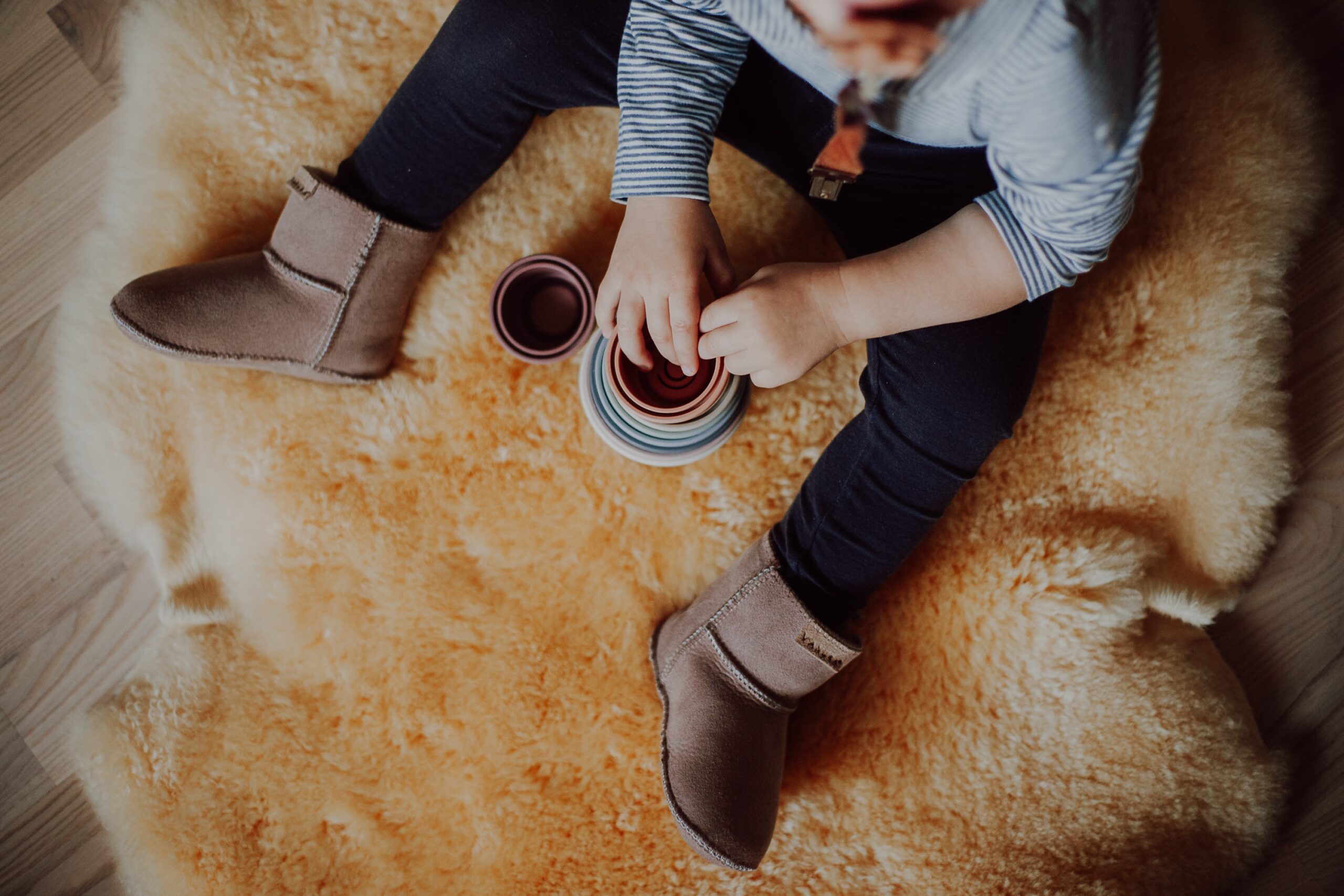 Innra byrðið er fyllt með mjúkri sauðarull sem er einstaklega húðvæn og hefur hipoalergísk áhrif. Hún dregur vel í sig raka og heldur fótunum þurrum og þægilegum. Náttúrulegir inniskór eru þægileg og örugg lausn sem heldur barninu hlýju frá fyrstu vikunum.