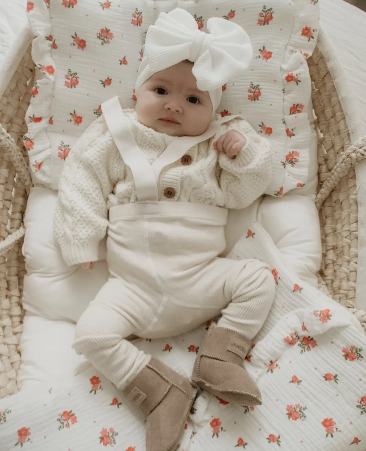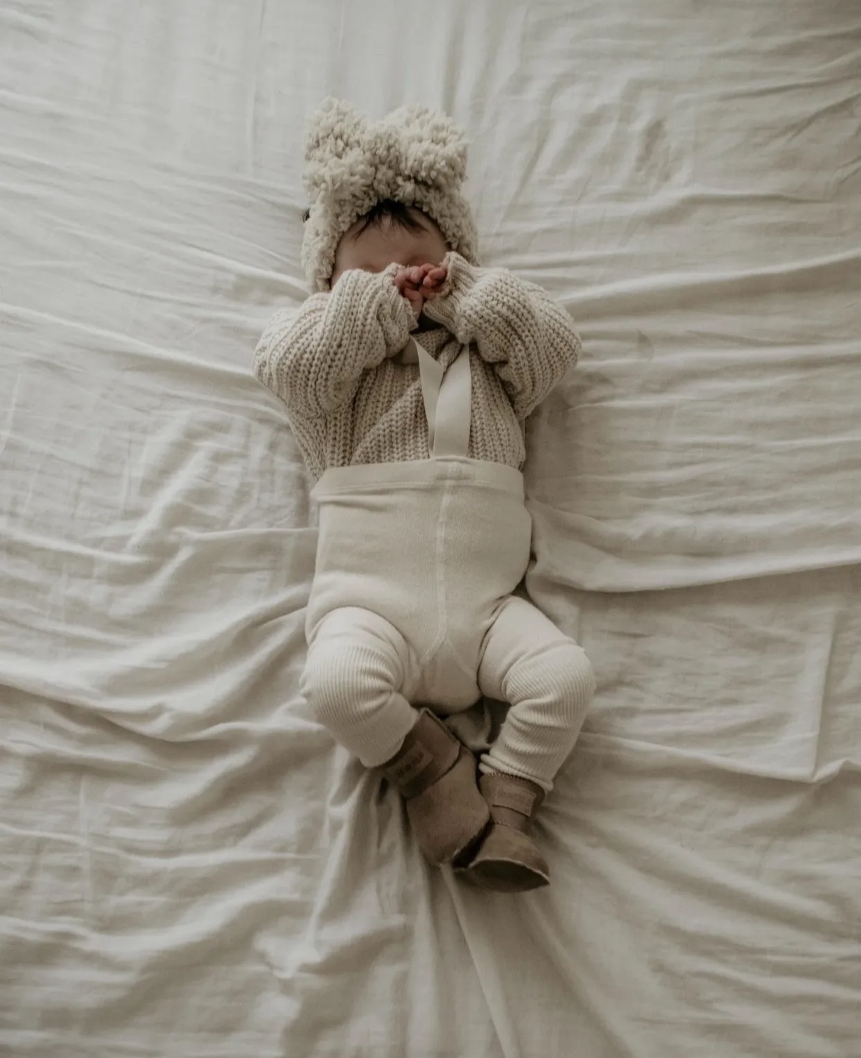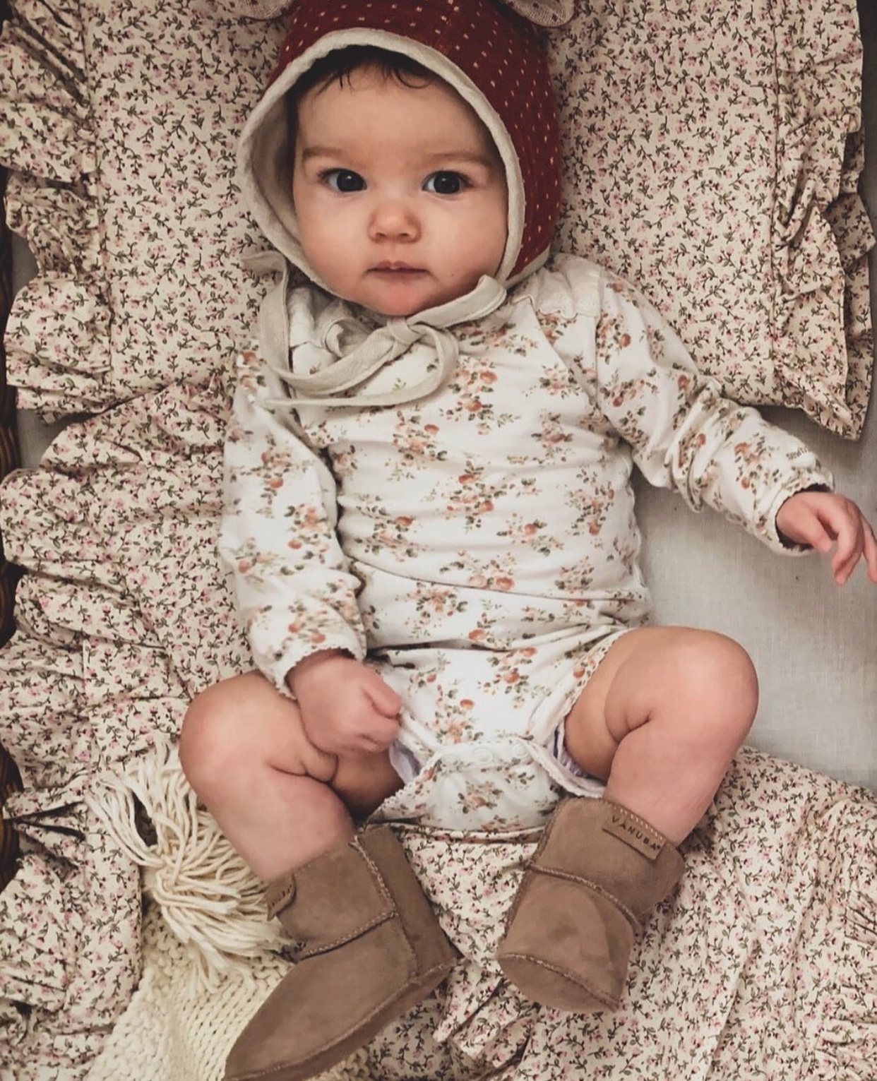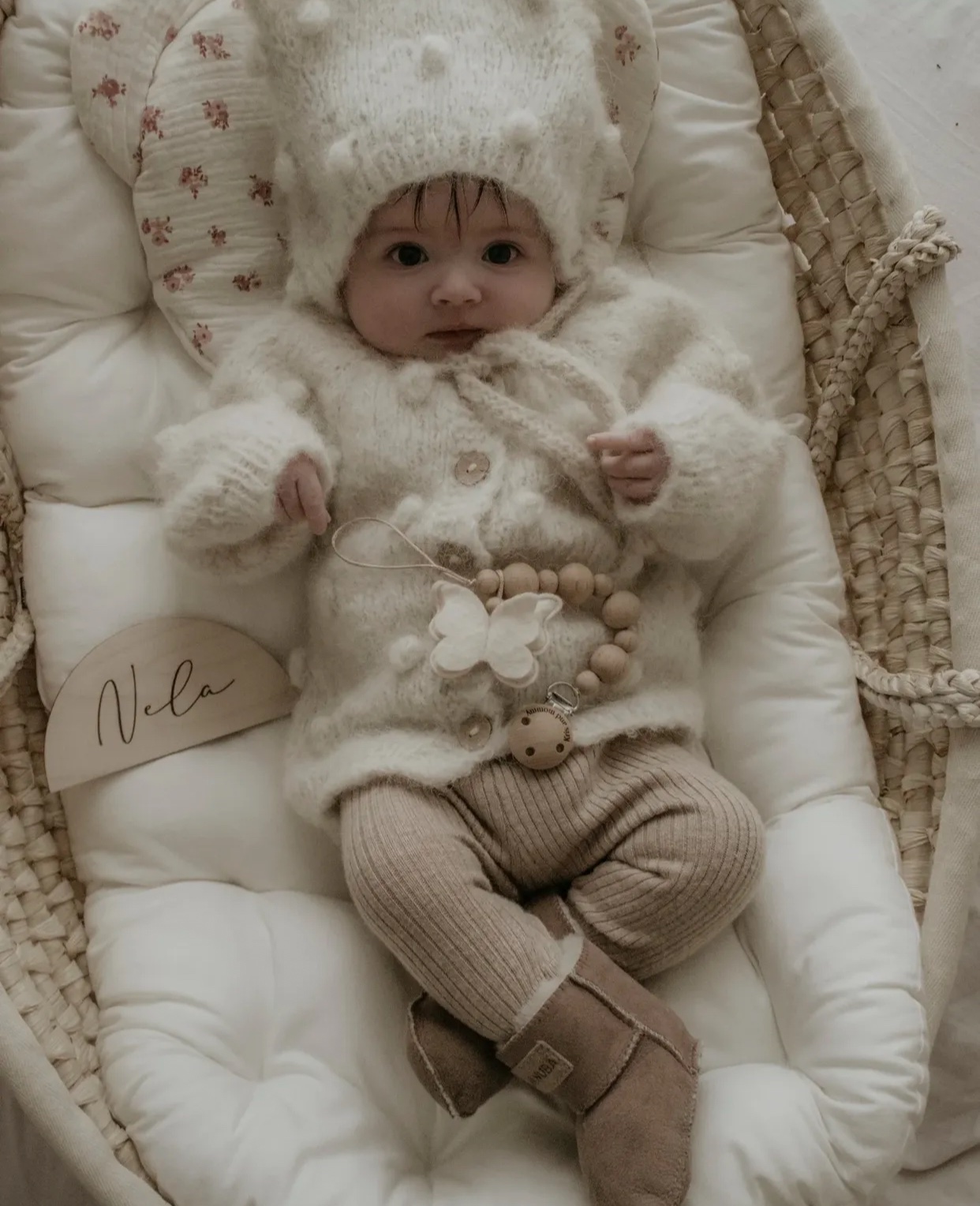 Innra byrðið er fyllt með mjúkri sauðarull sem er einstaklega húðvæn og hefur hipoalergísk áhrif. Hún dregur vel í sig raka og heldur fótunum þurrum og þægilegum. Náttúrulegir inniskór eru þægileg og örugg lausn sem heldur barninu hlýju frá fyrstu vikunum.