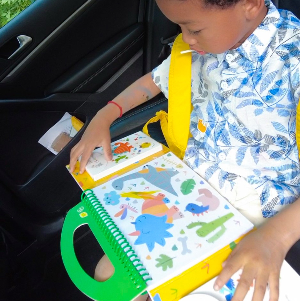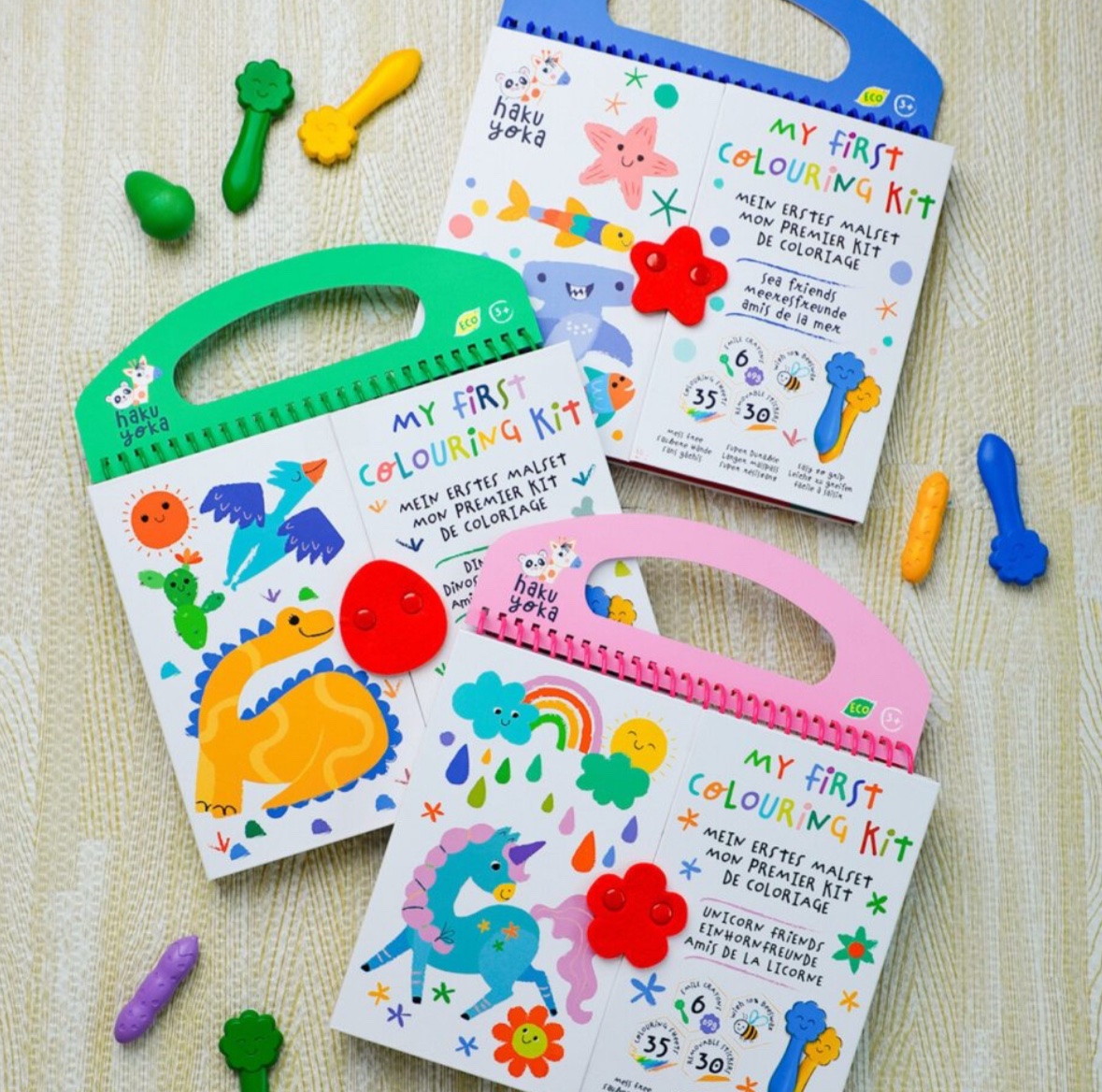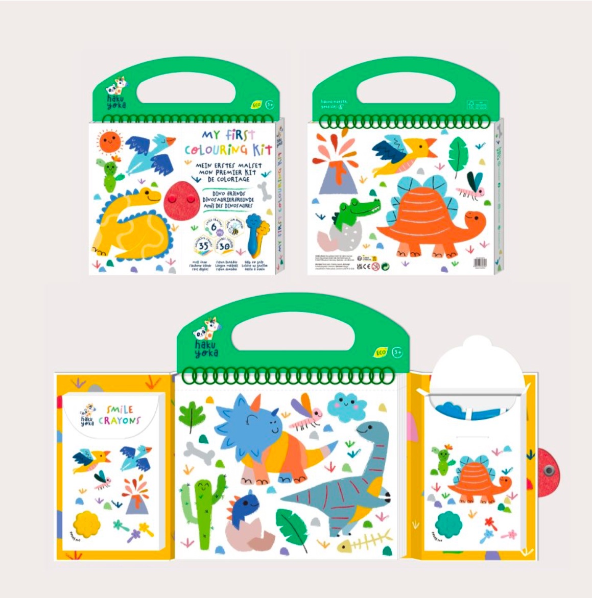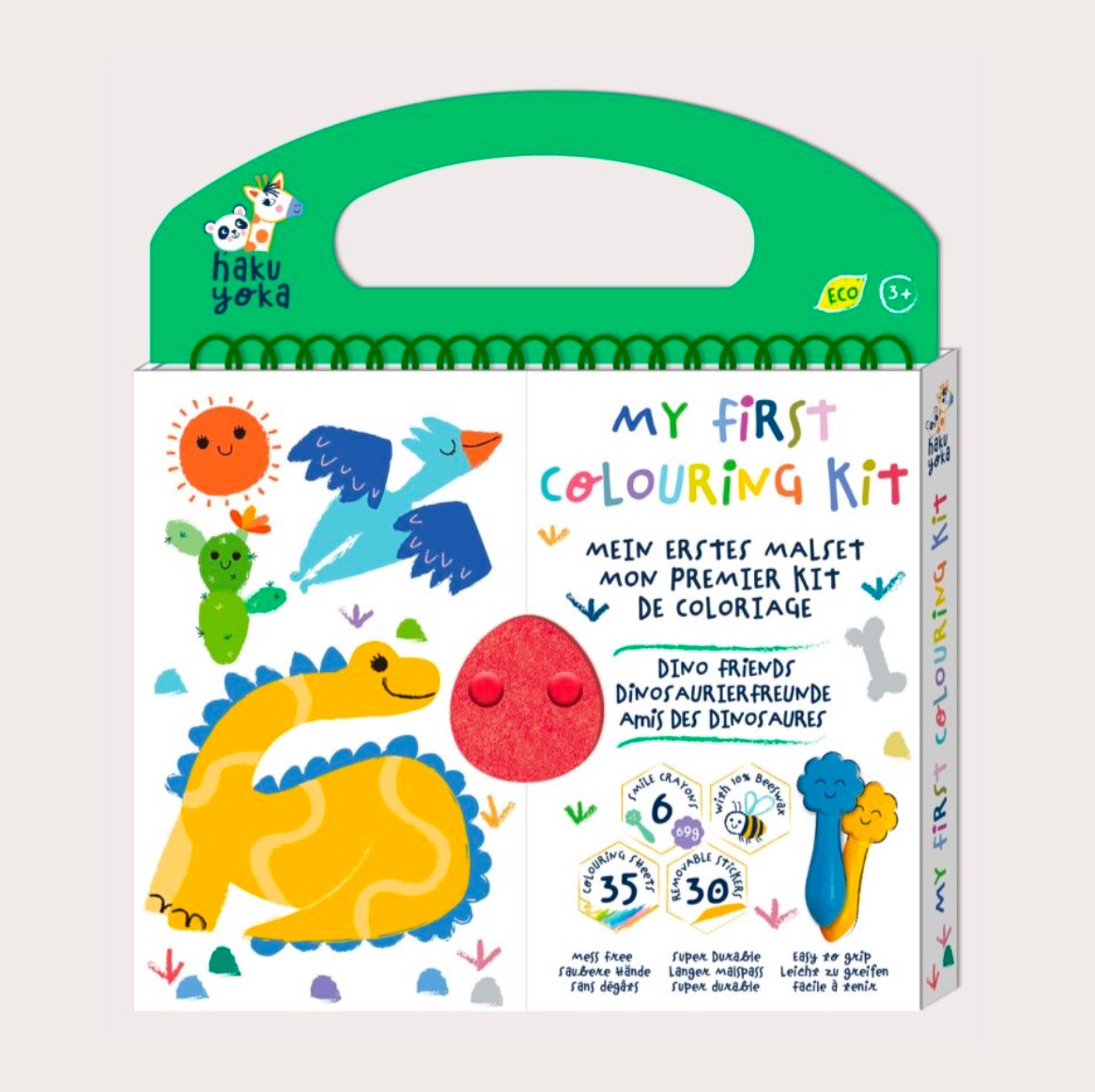 My first colouring kit is a great start for a young child learning to draw. The set includes six quality crayons, all with smiling faces and made with beeswax, 30 reusable stickers, and 35 pages with pre-drawn images for the child to colour. The set functions like a book that can be opened and closed, making it easy to keep the crayons, stickers, and drawings well-organized. It has a handle, making it easy to carry, which is why it is perfect for vacations, plane or car trips, or restaurants where a bit of entertainment is needed. This set features themes from the world of dinosaurs.