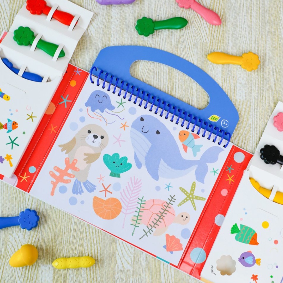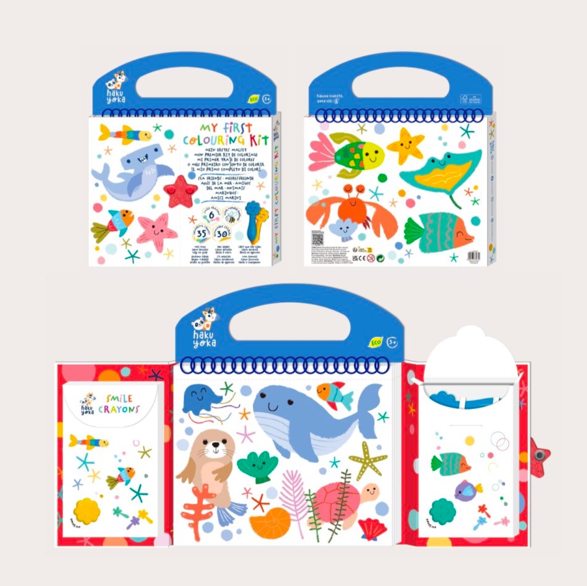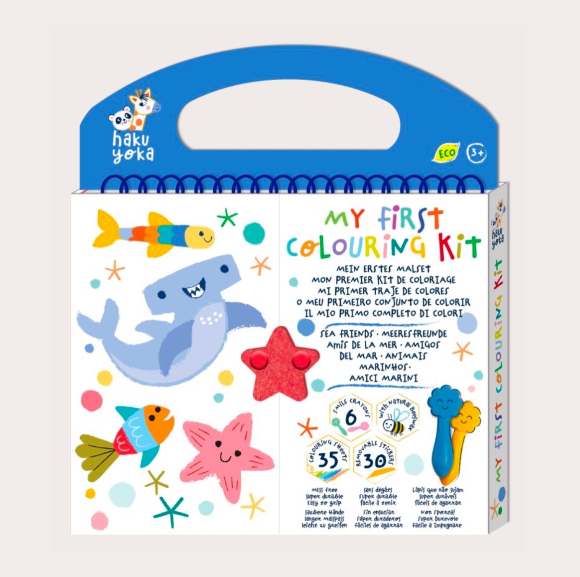 My first colouring kit is a great start for a young child learning to draw. The set includes six quality crayons, all with smiling faces and made with beeswax, 30 reusable stickers, and 35 pages with pre-drawn images for the child to colour. The set functions like a book that can be opened and closed, making it easy to keep the crayons, stickers, and drawings well-organized. It has a handle, making it easy to carry, which is why it is perfect for vacations, plane or car trips, or restaurants where a bit of entertainment is needed. This set features themes from the world of the ocean.