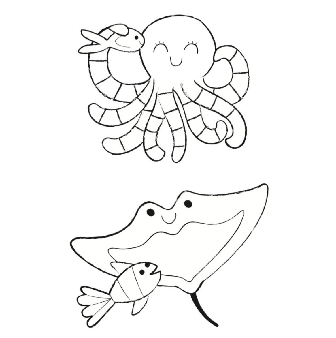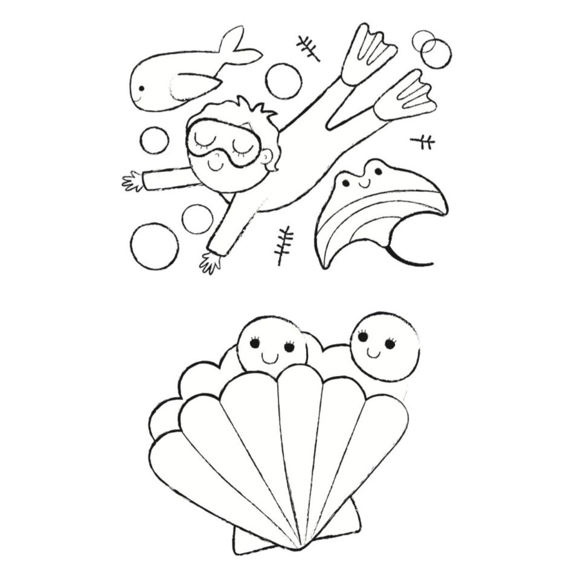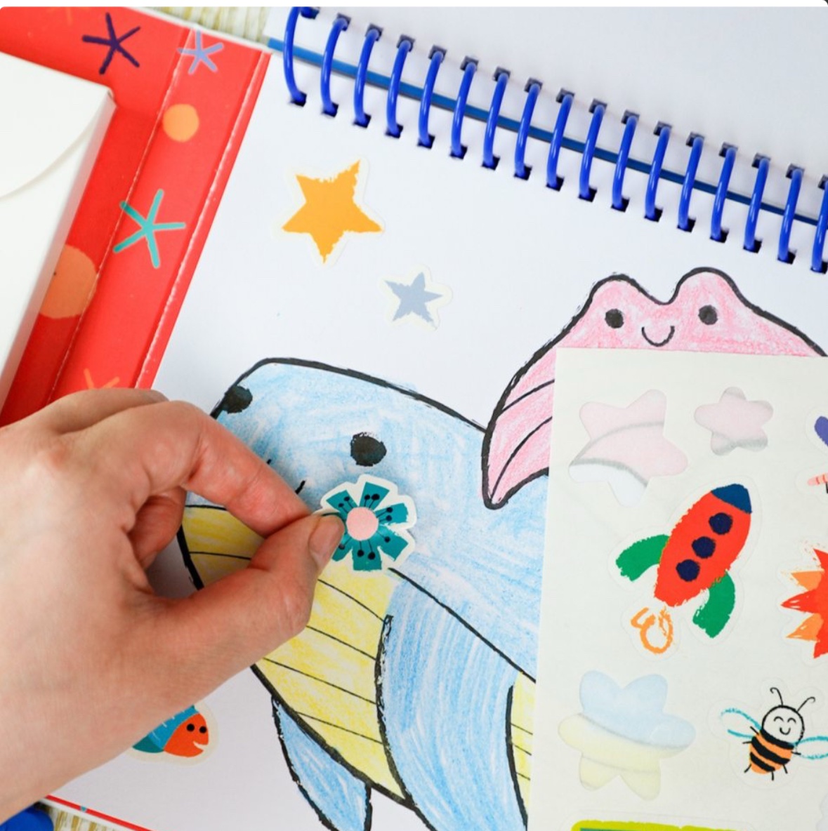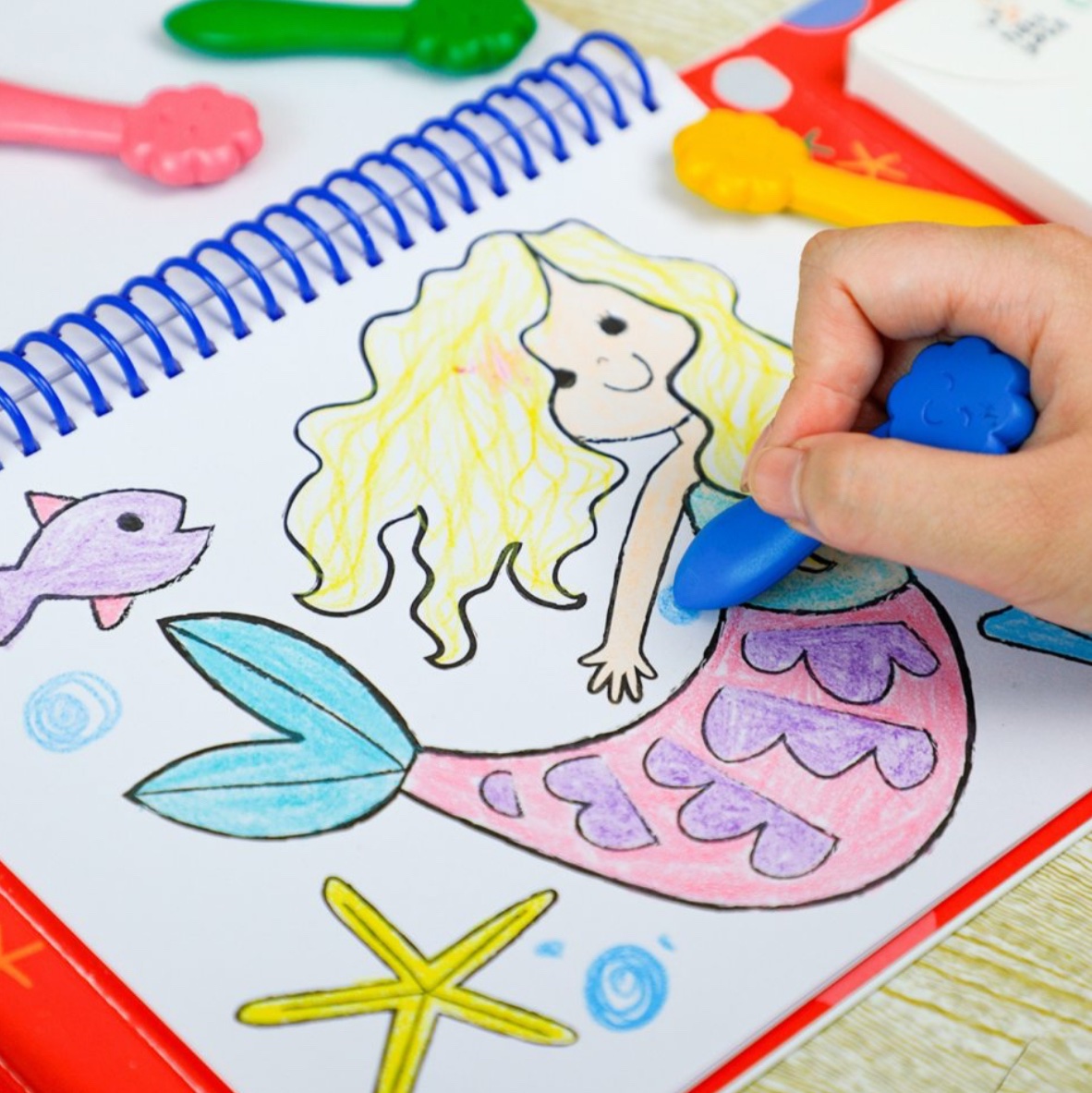 My first colouring kit is a great start for a young child learning to draw. The set includes six quality crayons, all with smiling faces and made with beeswax, 30 reusable stickers, and 35 pages with pre-drawn images for the child to colour. The set functions like a book that can be opened and closed, making it easy to keep the crayons, stickers, and drawings well-organized. It has a handle, making it easy to carry, which is why it is perfect for vacations, plane or car trips, or restaurants where a bit of entertainment is needed. This set features themes from the world of the ocean.