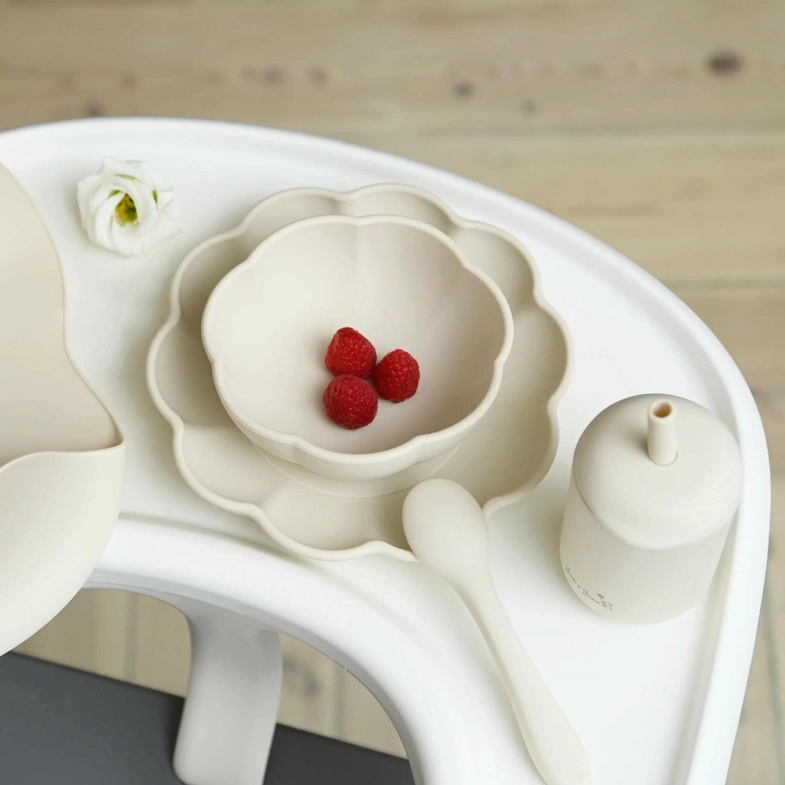 The set consists of a plate, bowl, cup and a spoon. The silicone plate and bowl come with a suction base, adhering to smooth surfaces to minimize spills for little ones learning to eat independently. Made from platinum food-grade silicone, the tableware withstands high temperatures and is suitable for microwave and dishwasher use. Typically, a quick wipe with hot water is sufficient for cleaning though.