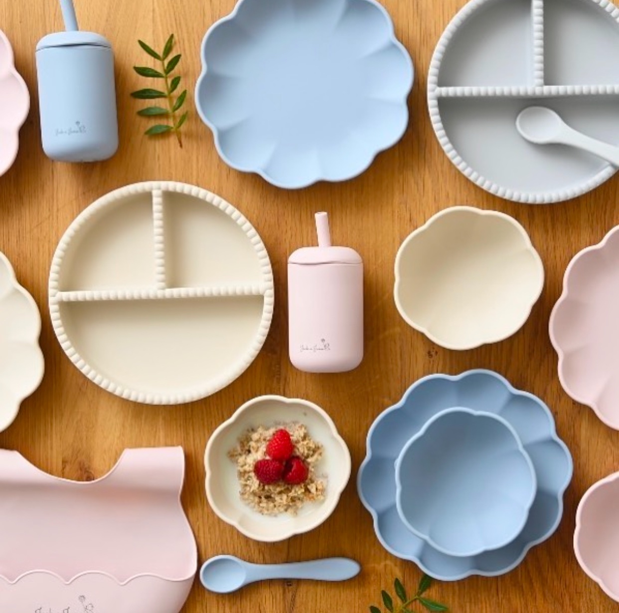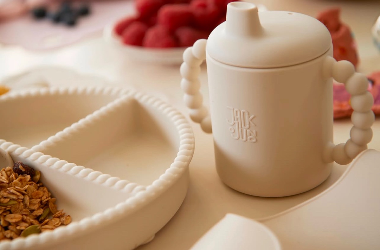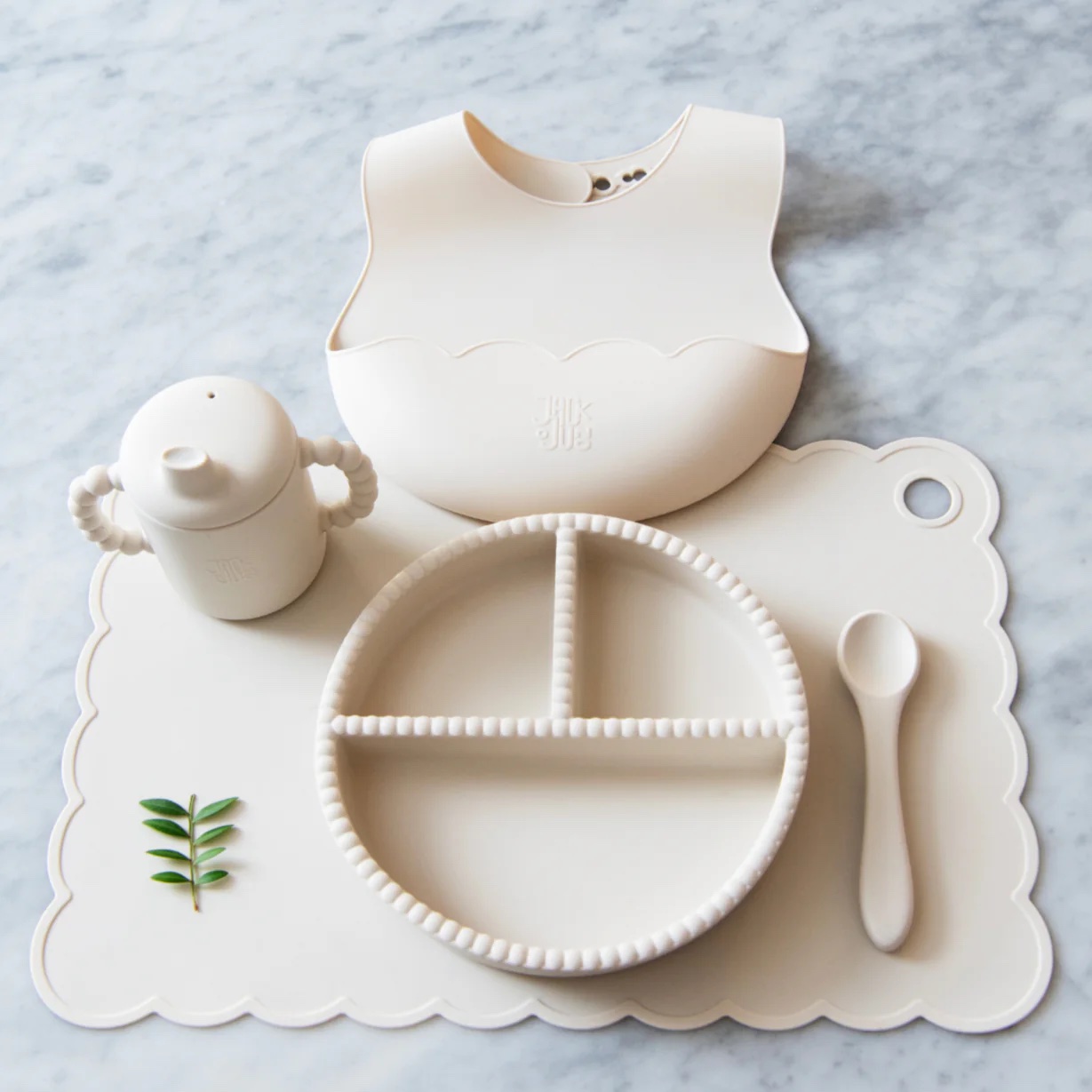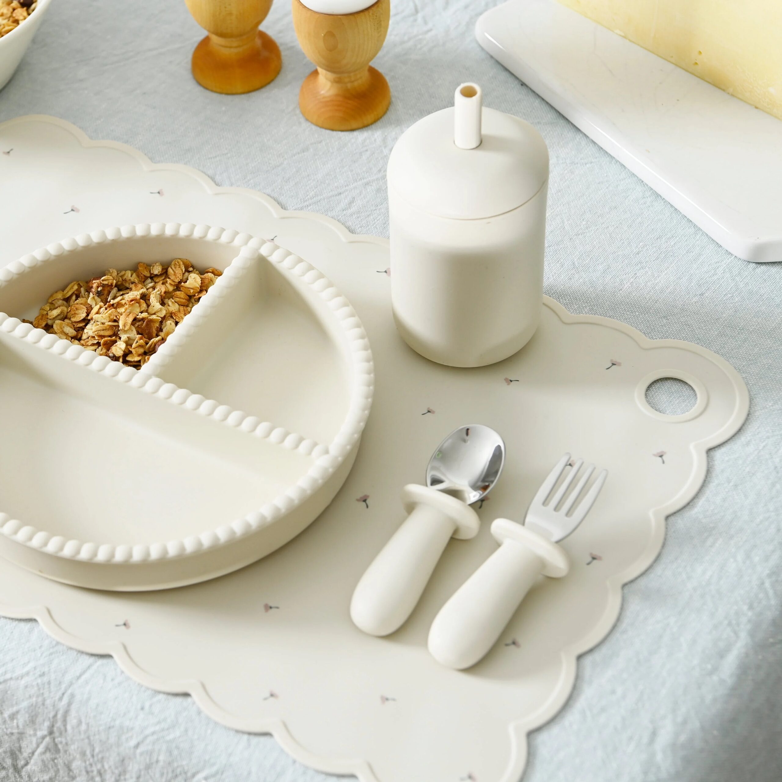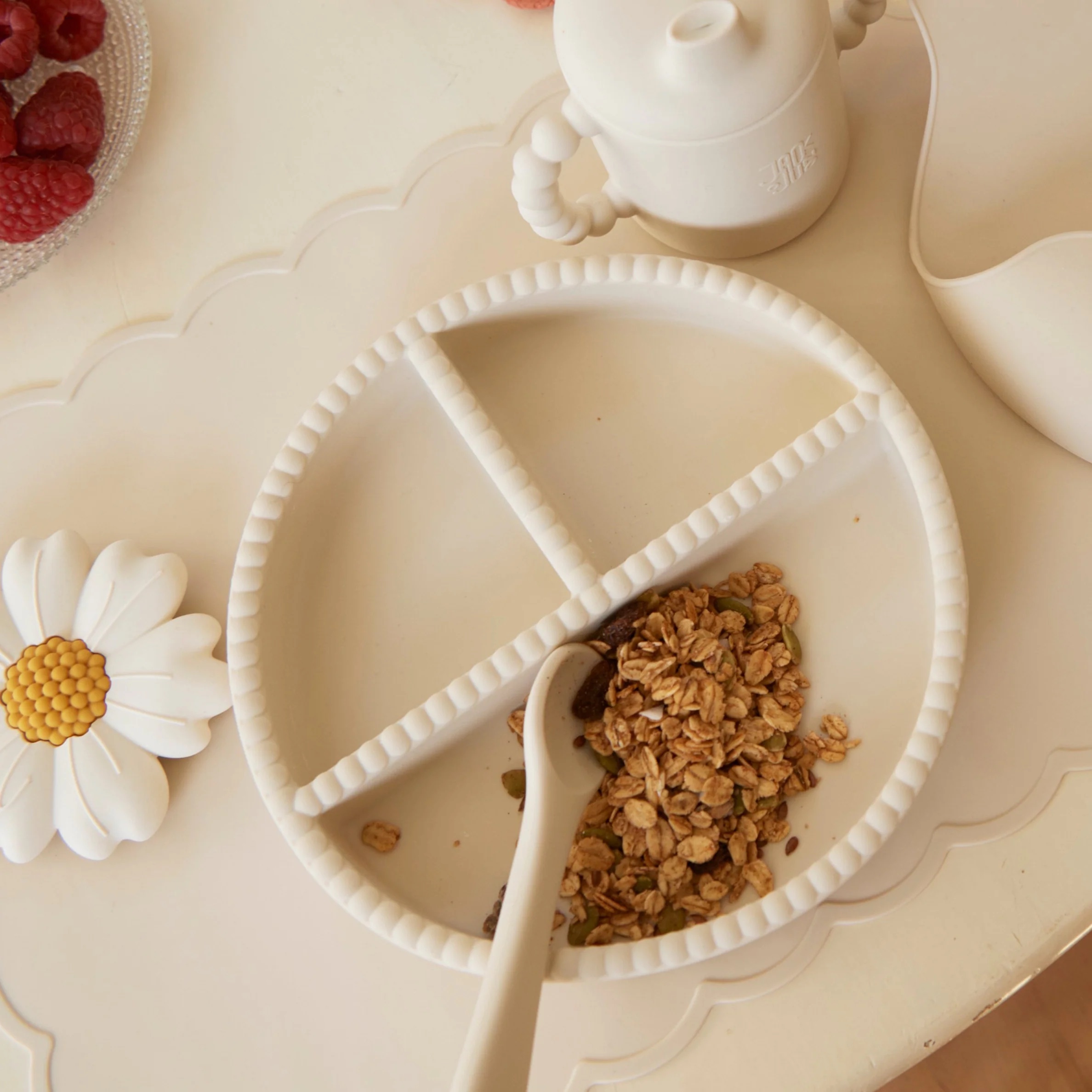 The set consists of a divided plate for picky little eaters and a spoon. The silicone plate comes with a suction base, adhering to smooth surfaces to minimize spills for little ones learning to eat independently. Made from food-grade silicone, the tableware withstands high temperatures and is suitable for microwave and dishwasher use. Typically, a quick wipe with hot water is sufficient for cleaning though.