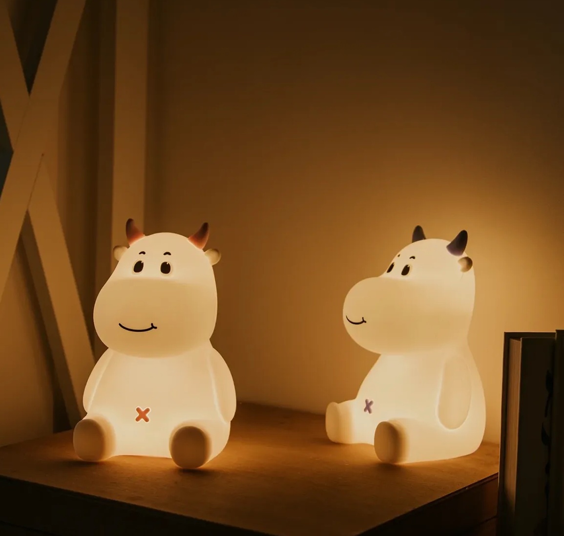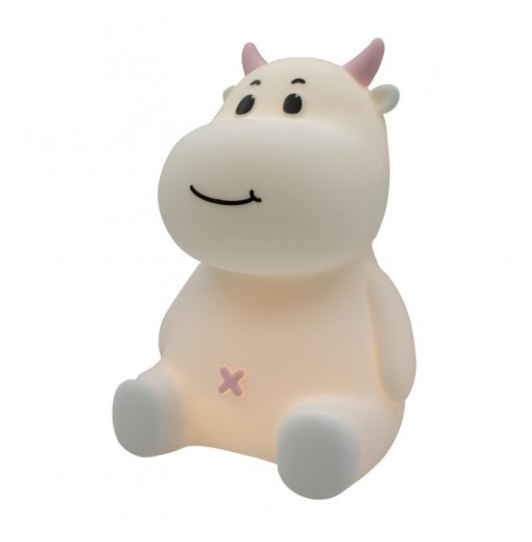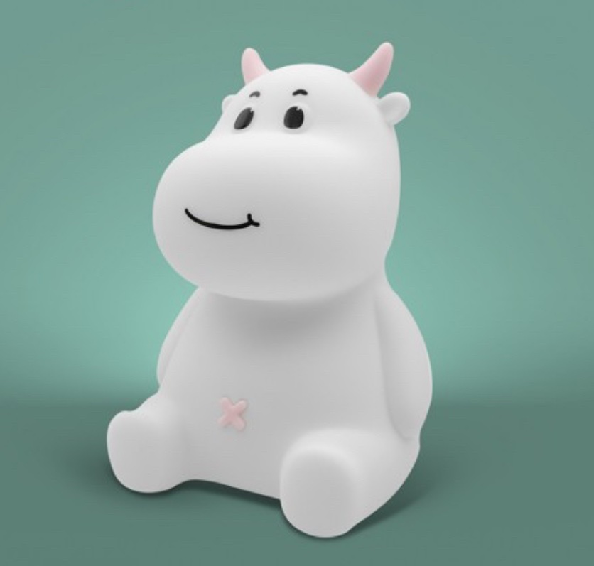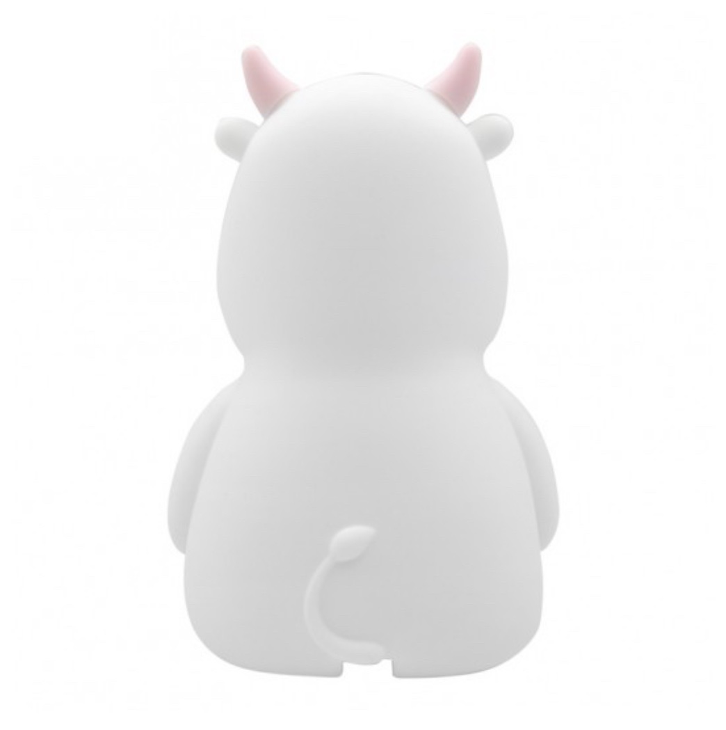 Cow-shaped lamp with blue accents adds a fun, friendly touch.
