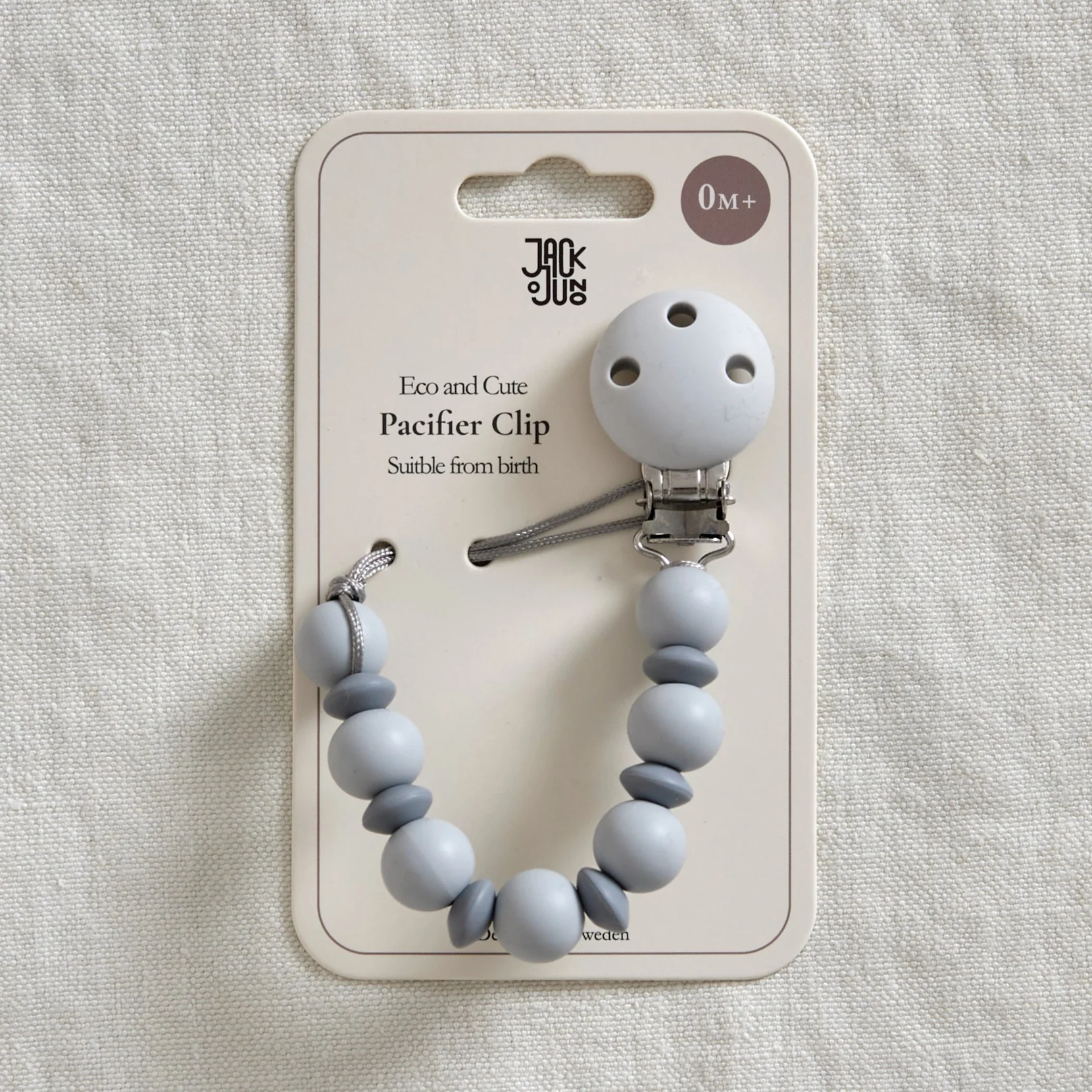 Please note that this is not a toy. Before each use, check the entire pacifier clip and throw it away at first sign of weakness and/or damage. Never lengthen or attach it to cords, ribbons or loose parts as this may cause choking hazard. The pacifier clip should only be attached to baby’s clothing and nothing else. Do not use it when the baby is in the crib, bed or unsupervised. Wash by hand with mild soap and water, do not sterilize. Change pacifier clips every 3-4 months.
