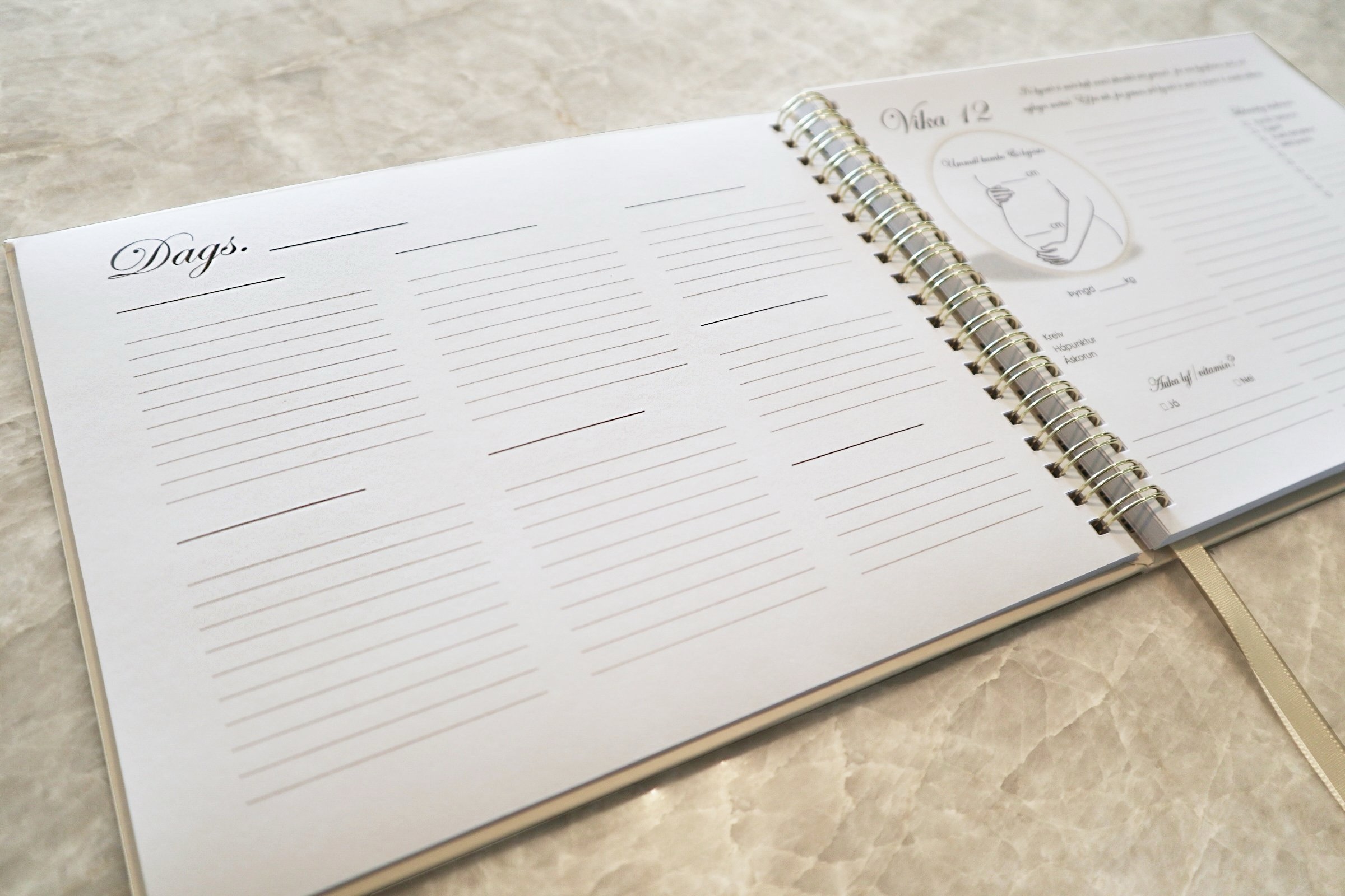 Bókin er 108 blaðsíður og hefur að geyma vikulega skipulagsdagbók og ýmsar skemmtilegar leiðir til að halda utanum minningar tengdar meðgöngunni, breytingar á líkama og heilsu, einkennum, sónarmyndir og annað sem gaman er að muna eftir, allt frá 3. viku að fæðingu barnsins.