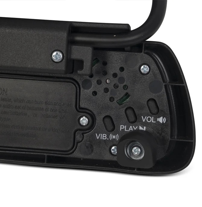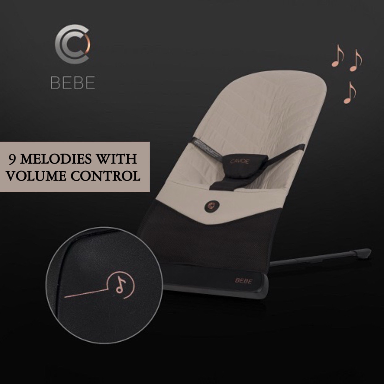 Stolinn er með innbyggðum hátalara, þannig að hvíld barnsins má auðvelda með níu viðeigandi melódíum. Hljóðstyrksstýring og aukafunction af mjúkri vibri heldur barninu sofandi, og þú getur notið kaffibolls í friði eftir erfiðan dag. Panelinn er rafhlaðinn, þannig að þú þarft ekki að takmarka staðsetningu stólsins eftir lengd snúru.