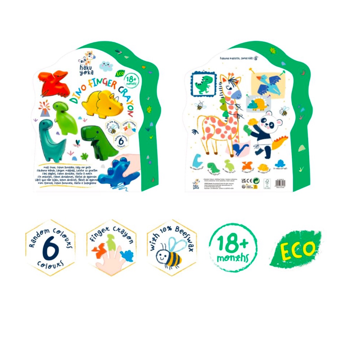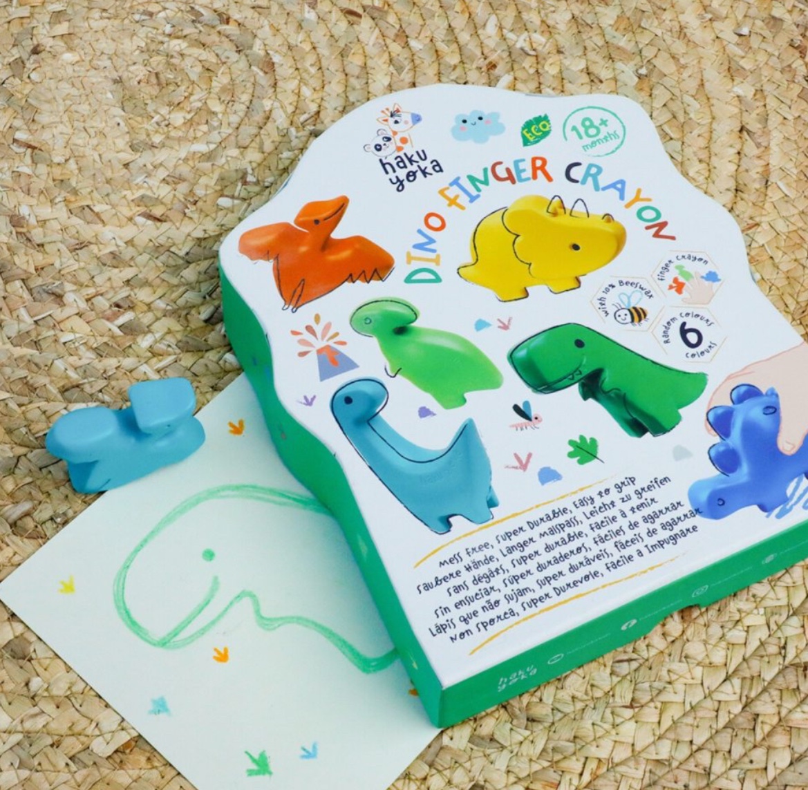 A young child who is just starting to use colours may sometimes struggle to hold them properly. Here, the extra-large crayons from Haku Yoka are great beginner colours because they are easy to grip and hold, making them easy to colour with. This set contains six cute dinosaurs that, in addition to being used for colouring, can also function as finger puppets. Please note that these beginner crayons do not colour as intensely as the other crayons from Haku Yoka, but this also means there is less crayon residue around the drawing paper.