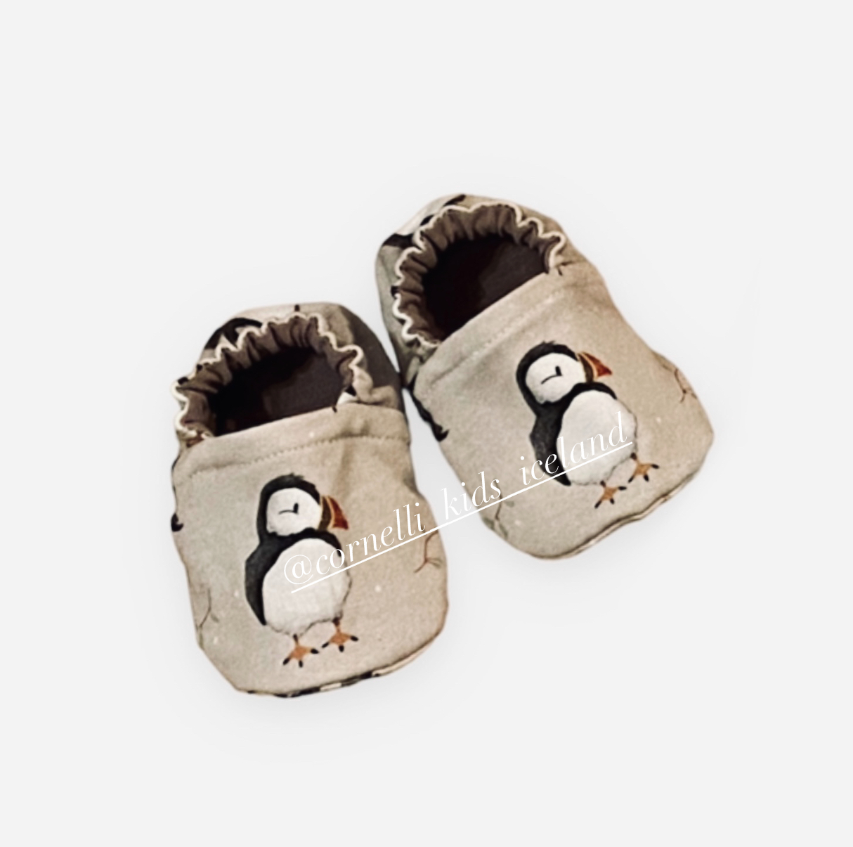 Æðislegir og rosalega mjúkir ungbarna skór með puffins mynstri. 95% lifrænn bómull, 5% teygja og einstaklega mjúkt 100% bambus efni að innan. Hægt er að panta úr hvaða mynstri sem er til hjá Cornelli.